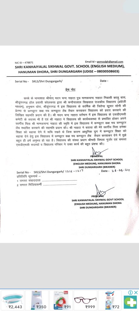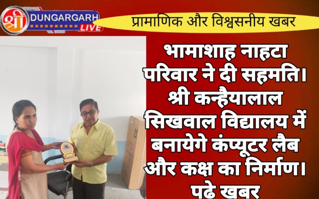 कस्बे के NH11 स्थित श्री कन्हैयालाल सिखवाल राजकीय अंग्रेजी माध्यमिक विद्यालय, हनुमान धोरा में कम्प्यूटर लेब के साथ कम्प्यूटर कक्ष का निर्माण जल्द ही करवाया जायेगा। विद्यालय के अध्यापक रमेश कुमार शर्मा ने बताया कि विद्यालय के कार्मिक जितेंद्र कुमार सोनी की प्रेरणा से कस्बे के भामाशाह कोलकाता प्रवासी मदनचंद पुत्र माणकचंद नाहटा द्वारा इस कक्ष के निर्माण के लिए लिखित सहमति दी है।मदन चन्द नाहटा वर्तमान में इस विद्यालय के एसडीएमसी कमेटी के सदस्य भी है एवं नाहटा ने विद्यालय की कार्यव्यवस्था से प्रभावित होकर अपने स्वर्गीय पिता माणकचन्द नाहटा की स्मृति में इस विद्यालय में कम्प्यूटर कक्ष मय कम्प्यूटर लैब स्थापित करवाने की सहमति प्रदान की। नाहटा ने बताया की मेरे स्वर्गीय पिता हमेशा शिक्षा को बढावा देने में रूचि रखते थे जिस कारण आधुनिक युग में कम्प्यूटर शिक्षा को बढावा देने हेतु इस विद्यालय में कम्प्यूटर कक्ष मय कम्प्यूटर लैब तैयार करवाकर देने में मुझे बहुत ही हर्ष अनुभव हो रहा है। विद्यालय की संस्था प्रधान श्रीमती विमला गुर्जर एवं समस्त एसडीएमसी सदस्यों व विद्यालय परिवार ने उक्त कार्य की बहुत प्रशंसा की।