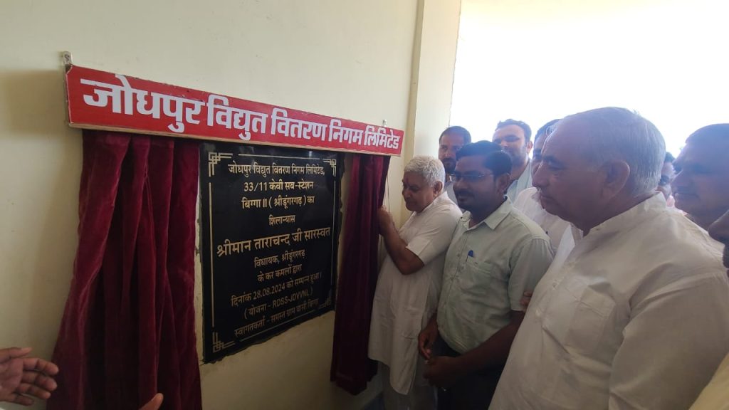 श्रीडूंगरगढ़ – आज विधायक ताराचंद सारस्वत ने बिग्गा 33/11 जीएसएस का लोकार्पण किया ,विधायक ताराचंद सारस्वत ने कहां कि अब मेरा एक ही लक्ष्य बदलता हुआ श्रीडूंगरगढ़, बढता हुआ श्रीडूंगरगढ़ बने। इस जीएसएस से बिग्गा, बिग्गा रोही आदि गांव में बिजली समस्या से निजात मिलेगी। विधायक सारस्वत ने कहा कि मेरा केवल एक ही लक्ष्य है क्षेत्र का विकास। इस दौरान कार्यक्रम में सांतलेरा के ग्रामीणों ने ट्रांसफार्मर जला हुआ होने समस्या से विधायक को अवगत करवाया जिसका संज्ञान लेते हुए विधायक सारस्वत ने बिजली विभाग के उच्च अधिकारियों से फोन पर वार्ताकर ट्रांफार्मर कल तक लगाने की बात कही जिससे ग्रामीणों में खुशी की लहर दौड़ पड़ी। इस दौरान श्री विश्वकर्मा कौशल विकास बोर्ड अध्यक्ष रामगोपाल सुथार,सरपंच जसबीर सारण,बजरंगलाल ओझा,ओबीसी मोर्चा जिलाध्यक्ष विनोद गिरी गुसाईं,शहर महामंत्री महेश राजोतिया,शिव तावनियां,बिजली विभाग के XEN विष्णु मेथी,AEN राजेश मीणा,मंच पर विराजमान रहे। इस दौरान ग्रामवासियों ने विधायक सारस्वत एवं रामगोपाल सुथार का साफा शॉल ओढ़ाकर सम्मानित किया और समस्त मंचासीन का माला पहनाकर स्वागत किया। मंच का संचालन लक्ष्मी नारायण सेवग ने किया। इस अवसर पर नंदलाल ओझा,मेघराज पुरोहित,भंवरलाल तावनियां,जगदीश मेघवाल,कैलाश मेघवाल,रूपाराम बावरी, पार्षद भरत सुथार,संतोष ओझा,पवन सारस्वत,गणेश आचार्य,सुनील व्यास,रामनिवास ओझा,शंकर लाल पुरोहित,पूनम स्वामी, विजय शंकर व्यास,ओम प्रकाश,हंसराज मेघवाल,सोहनलाल,महेंद्र सिंह,शंकर स्वामी,श्याम सुन्दर दर्जी,बाबुलाल गिला,गोपाल गोदारा,रमेश जाखड़, सुरजा राम रैगर,सांतलेरा गांव से मालाराम तावनियां,सहीराम भुवाल,मोतीराम जाखड़,हरिशंकर पुरोहित ,भगवान सिंह तंवर,सहित ग्रामवासी उपस्थित रहे