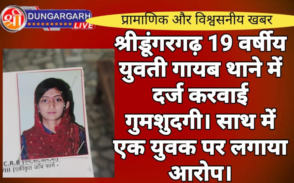 श्रीडूंगरगढ़ रीड़ी निवासी नवरंग राम ने पुलिस को दी रिपोर्ट के अनुसार बाना गांव के खेत में काश्त करता है और परिवार सहित वहां रहता है 29 जुलाई को रात्रि 11:00 बजे उसकी पुत्रवधू 19 वर्षीय तारा पत्नी शिवलाल गायब हो गई थी।हमारे द्वारा लगातार प्रयास किया गया लेकिन वह नहीं मिली अब हमें सूचना मिली है की पलाना निवासी राकेश पुत्र मदनलाल उसकी पुत्रवधू तारा को बहला फुसलाकर ले गया है। युवक द्वारा 1 वर्ष पूर्व अभी इस तरह की घटना को विवाहिता के पीहर से अंजाम भी दिया गया था जिसके बाद माफी मांगने पर कोई रिपोर्ट दर्ज नहीं करवाई गई थी। पुलिस ने परिवादी की शिकायत पर गुमशूदगी दर्ज कर ली है और मामले की जांच शुरू कर दी गई है।