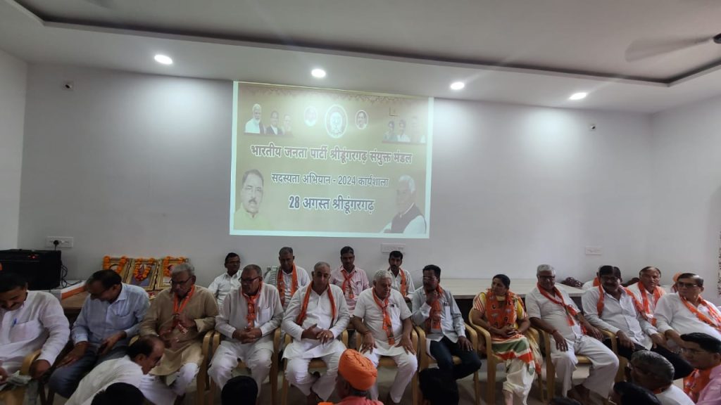 भाजपा के राष्ट्रीय स्तर पर 1 सितंबर से प्रारंभ हो रहे सदस्यता अभियान को लेकर भारतीय जनता पार्टी श्रीडूंगरगढ़ कार्यालय पर आज सदस्यता अभियान 2024 मंडल कार्यशाला बैठक में विधायक ताराचंद सारस्वत एवं जिला सह संयोजक श्याम पंचारिया , सरोज प्रजापत,श्री विश्वकर्मा कौशल विकास बोर्ड अध्यक्ष रामगोपाल सुथार ने भारत माता के तेल चित्र पर माल्यार्पण कर दीप प्रज्ज्वलित कर शुरुवात की। सदस्यता अभियान के विधानसभा संयोजक हेमनाथ जाखड़,महामंत्री महेश राजोतिया,जगदीश पारीक ने सभी अतिथियों का दुपट्टा पहनाकर स्वागत किया। बैठक में सदस्यता अभियान के जिला सह संयोजक श्याम पंचारिया व सरोज प्रजापत ने सदस्यता अभियान के बारे में विस्तार से जानकारी प्रदान की तथा बताया कि प्रत्येक बूथ पर 200 सदस्य बनाने हैं। इसके लिए हर बूथ पर एक प्रभारी व एक सह प्रभारी नियुक्त किया जा रहा है। बैठक में सदस्यता ग्रहण करने के लिए दिए गए नंबर पर मिस्ड कॉल, नमो ऐप व क्यू आर कोड के माध्यम से सदस्यता अभियान को सफल बनाया जाएगा। इस दौरान विधायक ताराचंद सारस्वत ने कार्यशाला को संबोधित करते हुए कहा कि आगामी सदस्यता अभियान में नए सदस्य बनाने के साथ साथ पुराने सदस्यों को भी पुन: सदस्यता लेनी होगी एवं प्रत्येक बूथ में कम से कम दो सौ और अधिकतम की कोई सीमा नहीं हैं लक्ष्य समय से पहले पूरा करने के लिए आवश्यक सुझाव दिए । कार्यशाला का संचालन मंडल महामंत्री एवं सदस्यता अभियान के मंडल संयोजक सुरेंद्र चुरा ने किया। इस दौरान विधायक ताराचंद सारस्वत,श्री विश्वकर्मा कौशल विकास बोर्ड अध्यक्ष रामगोपाल सुथार,नगरपालिका चेयरमैन मानमल शर्मा जिला महामंत्री एवं जिला सह संयोजक सदस्यता अभियान बीकानेर देहात श्याम पंचारिया,सरोज देवी प्रजापत,जिला उपाध्यक्ष शिव स्वामी,कुंभाराम सिद्ध,पूर्व प्रधान छैलूसिंह शेखावत,ओबीसी मोर्चा जिलाध्यक्ष विनोद गिरी गुसाईं,पूर्व नगरपालिका चेयरमैन रामेश्वर पारीक,किशन गोदारा,मोहन कुलडिया, धुडाराम डेलू,मंडल अध्यक्ष महावीर प्रजापत,शिव जोशी,महेंद्र सिंह,गिरधारी लाल गोदारा,मंडलों के महामंत्रीगण, विधानसभा संयोजक हेमनाथ जाखड़ सहित मंडल संयोजक,जिला परिषद सदस्यगण, सरपंचगण,पंचायत समिति सदस्यगण,पार्षदगण,बूथ अध्यक्षगण सहित भाजपा के वरिष्ठ पदाधिकारीगण एवं कार्यकर्तागण उपस्थित रहे।