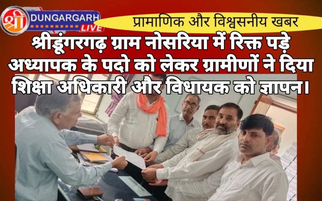 राजकीय उच्च माध्यमिक विद्यालय नोसरिया में रिक्त पद पर अध्यापक लगवाने बाबत आज दिया ज्ञापन। संदीप सिंह ने बताया की गांव में स्कूल तो है लेकिन बच्चो को पढ़ाने वाले अध्यापक नही है इसमें आठ पद स्कूल में रिक्त पड़े और प्रधानाचार्य का भी पद खाली है उप प्रधानाचार्य का पद रिक्त भूगोल व्याख्याता ,इतिहास व्याख्याता ,हिंदी व्याख्याता ,वरिष्ठ अध्यापक गणित ,वरिष्ठ अध्यापक सामाजिक, वरिष्ठ अध्यापक अंग्रेजी के पद रिक्त पड़े गांव के लोगों ने शिक्षा अधिकारी और विधायक महोदय को ज्ञापन देकर रिक्त पड़े पद को अध्यापक लगवाने को कहा।नेमाराम जी प्रजापत, संदीप सिंह मिंगसरिया, अशोक सिंह, मदन सिंह , दुलाराम जी प्रजापत, विजय सिंह ग्रामीणों ने दिया ज्ञापन।