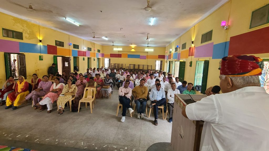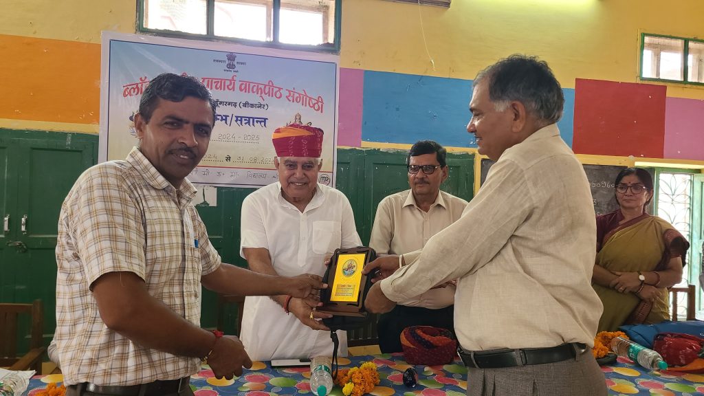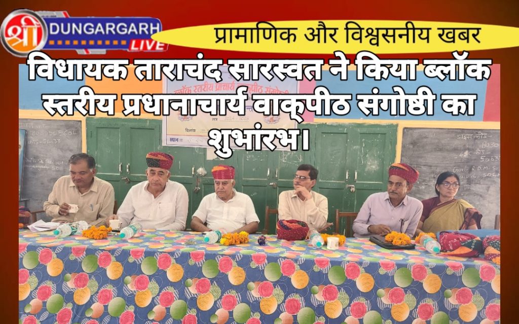 आज राजकीय रूपादेवी मोहता उच्च माध्यमिक विद्यालय में आयोजित ब्लॉक स्तरीय प्राचार्य वाकपीठ संगोष्ठी सत्र 2024-25 में श्रीडूंगरगढ़ विधायक ताराचंद सारस्वत बतौर मुख्य अतिथि सम्मिलित हुए। इस दौरान विधायक सारस्वत एवं श्री विश्वकर्मा बोर्ड अध्यक्ष रामगोपाल सुथार सरस्वती माता के तेल चित्र पर माल्यार्पण कर एवं दीप प्रज्ज्वलित कर कार्यक्रम की शुरुवात की। इस दौरान ब्लॉक शिक्षा अधिकारी ने विधायक सहित अतिथियों का माला और साफा पहनाकर स्वागत किया। मंच का संचालन रमेश सारस्वत ने किया। कार्यक्रम को संबोधित करते हुए विधायक सारस्वत ने कहा कि भारतीय संस्कृती में गुरू को सर्वोच्य स्थान दिया गया है। गांव व देश के विकास में हर शिक्षक का योगदान महत्वपूर्ण रहता है।मनुष्य को जीवन में आगे बढ़ने कर्तव्यों का ज्ञान व पालन करने की सीख गुरू से ही मिलती है।विधायक सारस्वत ने कहा कि शिक्षक कभी साधारण नही होता है प्रलय व निर्माण उनकी गोद में पलते है। शिक्षको का दायित्व है कि वे देश व प्रदेश के निर्माण के लिए अपने दायित्वो का पालन करते हुऐ बच्चो को गुणवत्ता व ज्ञानपूर्वक शिक्षा उपलब्ध करावें । उन्होने कहा कि बालको का भविष्य कोरे कागज की तरह होता है । जिनको शिक्षा देकर समाज की मुख्यधारा में लाने का कार्य शिक्षको का होता है । ग्रामीण व शहरी क्षेत्र में कार्यरत शिक्षक अपने कर्तव्यों का निर्वहन करते हुए बच्चो में शिक्षा के प्रति चेतना जागृत करे । शिक्षा से ही गांव व प्रदेश का विकास हो सकता है । उन्होने कहा कि शिक्षको के प्रयास से सरकारी स्कूलो में शिक्षा के स्तर में सूधार आया है । जिसके चलते सरकारी स्कूलो में अध्यनरत बालक बालिकाएं भी मेरिट में आ रहे है।इस अवसर पर शिक्षा अधिकारी श्री ओम जी प्रजापत,ईश्वरराम गरुवाACBEO,प्राचार्य श्री उमाशंकर जी सारण,श्री ओम जी शर्मा,श्रीमती सीमा जी चोधरी,श्री बजरंग जी सेवग,भाजपा शहर महामंत्री सुरेंद्र चुरा,शिव तावनियां,धनश्याम सुथार,विधायक के निजी सचिव रजनीकांत सारस्वत सहित विभिन्न राजकीय विद्यालयों के प्राचार्य उपस्थित रहे।