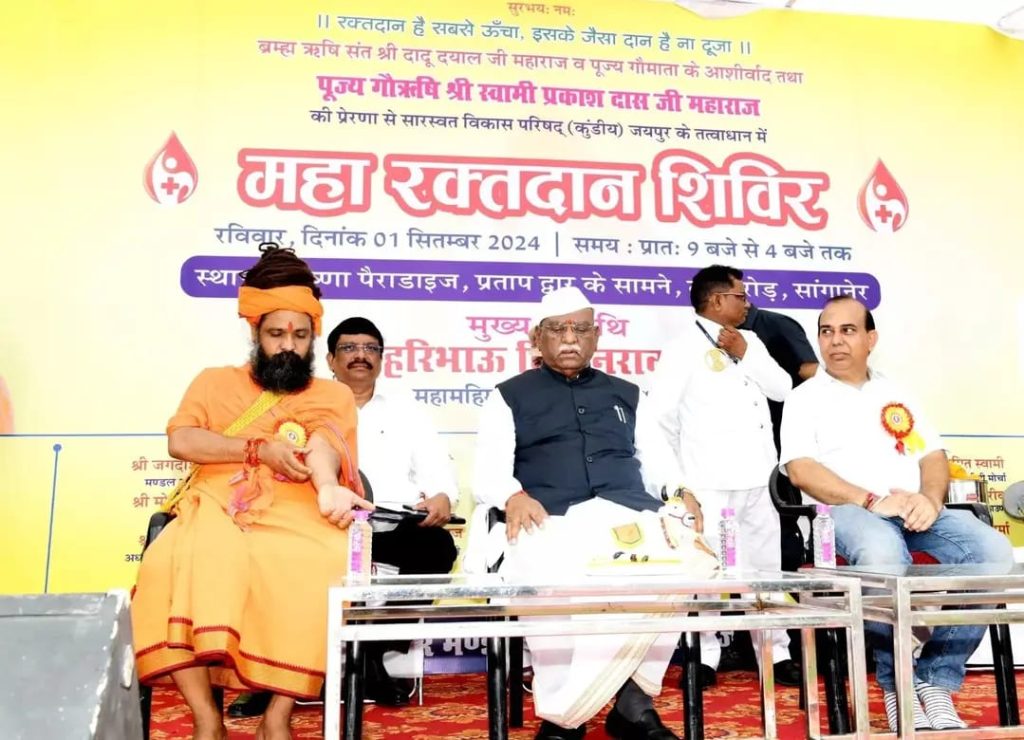 सारस्वत विकास परिषद कुंडिया जयपुर द्वारा गौऋषि श्री स्वामी प्रकाश दास जी महाराज की प्रेरणा से जयपुर में रक्तदान शिविर का का आयोजन हुआ, इस कार्यक्रम में मुख्य अतिथि के रूप में राज्यपाल श्री हरिभाऊ किशन राव बागड़े ने रक्तदाताओं का उत्साह बढ़ाया. महामहिम ने कहा कि इस तरह के आयोजन मानव सेवा के हित में होते रहने चाहिए . जयपुर शहर सांसद श्रीमती मंजू शर्मा ने कार्यक्रम में उपस्थित होकर कहा कि प्रत्येक सक्षम व्यक्ति को रक्त दान जरूर करना चाहिए . स्वामी श्री प्रकाशदास जी महाराज ने सभी रक्तदाताओं को आशिर्वाद दिया और कहा कि मानव कल्याण के लिए यह योगदान महादान है . सारस्वत विकास परिषद कुंडिया जयपुर के अध्यक्ष एवं श्रीडूंगरगढ़ विधायक ताराचंद सारस्वत के पुत्र श्री राजेश सारस्वत ने बताया कि यह संस्था गत सात वर्षों से रक्तदान शिविर लगाती आ रही है आज कार्यक्रम में युवाओं और मातृशक्ति ने बढ़ चढ़ कर हिस्सा लिया .कार्यक्रम में संस्था के महामन्त्री एडवोकेट हनुमान शर्मा और कोषाध्यक्ष सत्यनारायण सारस्वत , प्रवक्ता रामनिवास सारस्वत ,कैलाश ओझा, राजकुमार ओझा, शिवरतन, मुकेश सारस्वत, श्रीराम सारस्वत, परमेश्वर सारस्वत, दामोदर सारस्वत, मनोज ओझा, गौरीशंकर ,बाबूलाल सारस्वत ,ओमप्रकाश ,नन्दलाल जी, राजकुमार जी, श्रीराम जी, बंसी लाल जी आदित्य जी सुरेंद्र जी अनूपशहर , बेला कमल जी नीलकमल जी पवन जी विनोद , मोहन जी , मुरली जी मुकेश माखर , भावना नंदू जी अशोक जी वहां मौजूद रहकर अपनी सेवाएं दी वहीं प्रकाश दास जी महाराज कार्यक्रम के बीच भजन प्रस्तुत किये ।महामंत्री हनुमान शर्मा और मुख्य प्रवक्ता रामनिवास सारस्वत ने सभी कार्यकताओं और रक्तदाताओं को धन्यवाद प्रेषित किया ।