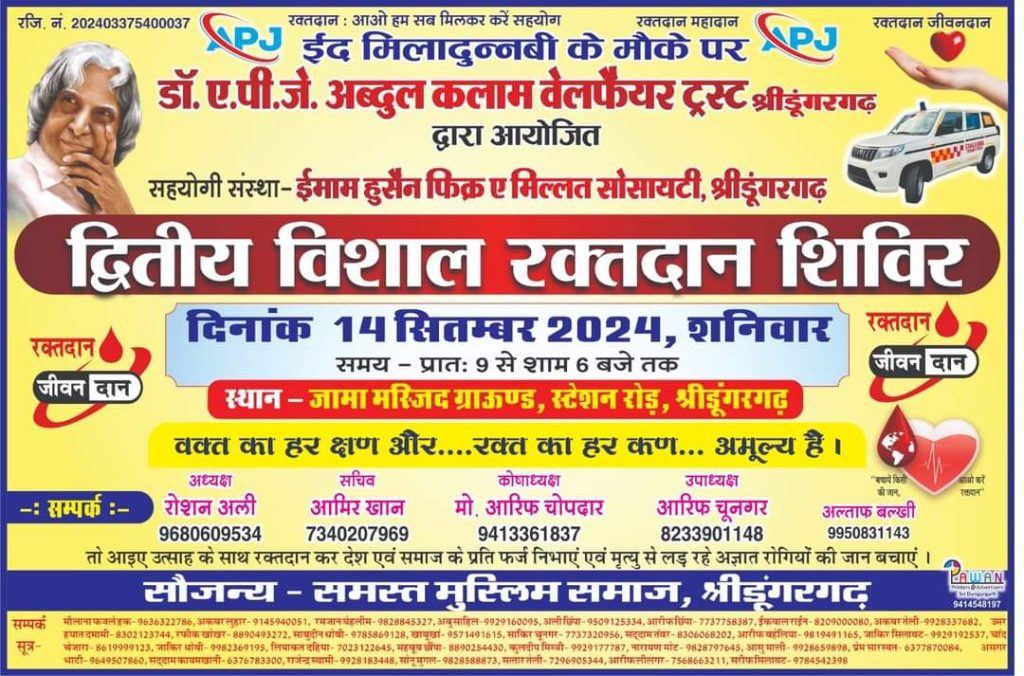 अब्दुल कलाम वेलफेयर सोसायटी द्वारा ईद मिलादुन्नबी के मौके पर 14 सितंबर को आयोजित किए जा रहे रक्तदान शिविर का स्थान जामा मस्जिद ग्राऊंड रहेगा। शिविर में सुबह 9 बजे से शाम 6 बजे तक रक्तदान किया जा सकेगा एवं पीबीएम सहित अन्य टीमों द्वारा रक्त संग्रहण किया जाएगा। शिविर की तैयारिया अभी से चालू हो गई है और अग्रिम पंजीयन भी शुरू हो गया है