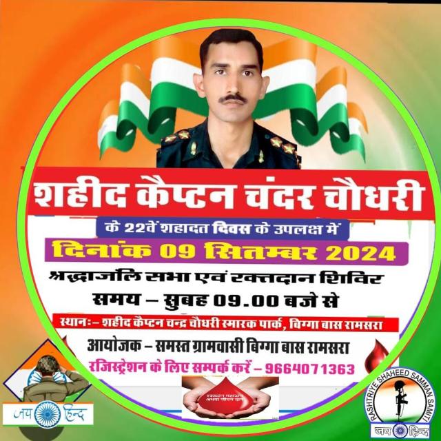 श्रीडूंगरगढ़ कैप्टन चंद्र चौधरी के 22वे बलिदान दिवस पर आयोजित श्रद्धांजली सभा के साथ रक्तदान शिविर का आयोजन किया गया है। 9 सितंबर को गांव बिग्ग़ा बास रामसरा में शहिद कैप्टन चंद्र चौधरी मेमोरियल पार्क में आयोजित किया गया है।समय सुबह 9 बजे से रक्तदान शिविर का अग्रिम पंजीयन शुरू हो गया है आप संपर्क करे। 9664071363