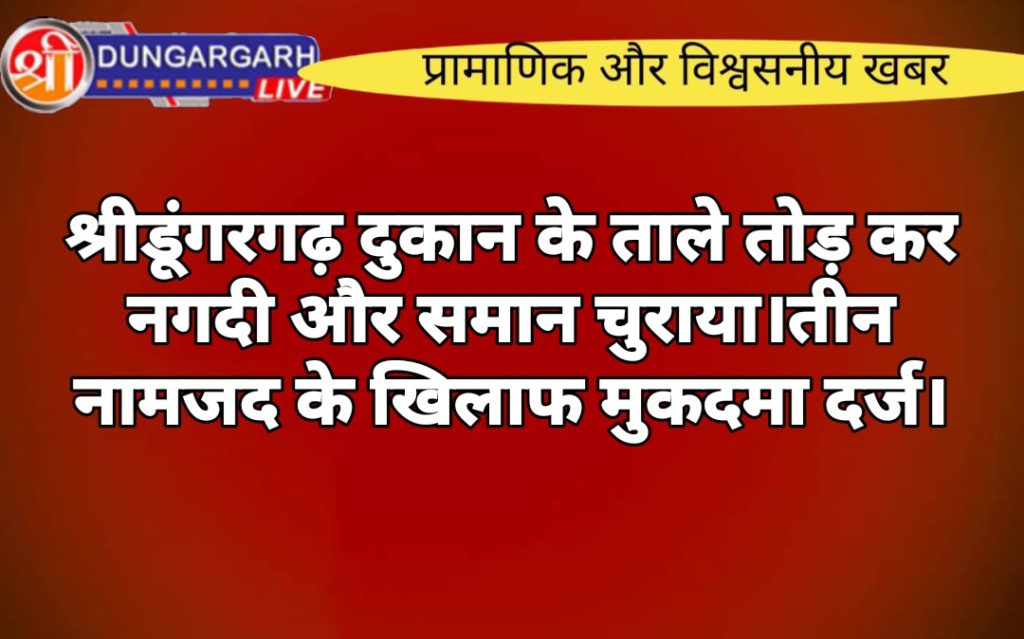 श्रीडूंगरगढ़ लाइव न्यूज़। घटना मोमासर गांव की है।पीड़ित मोमासर निवासी मनोज कुमार पुत्र ताराचंद खटीक ने इसी गांव के रतनराम पुत्र हड़मानाराम बावरी, बाबूलाल पुत्र बिश्नाराम नायक, राजूराम पुत्र नौरंगलाल नायक के खिलाफ आरोप लगाए है।परिवादी ने पुलिस को बताया कि गांव मोमासर में 29 अगस्त 2024 की रात टंकी बास, लाछड़सर रोड पर स्थित उसकी किराणा की दुकान में आरोपी नायायज रूप से घुसे और गल्ले में रखे 27 हजार रूपए व दुकान रखा पानमसाला के पैकेट, किराने का सामान, सिगरेट के पैकेट सहित करीब 10 हजार रूपए का सामान चोरी कर ले गए। परिवादी ने चोरों ने पकड़ने व सामान व नगदी वसूल करवाने की मांग की है। पुलिस ने मामला दर्ज कर जांच हैड कांस्टेबल देवाराम को दी है।