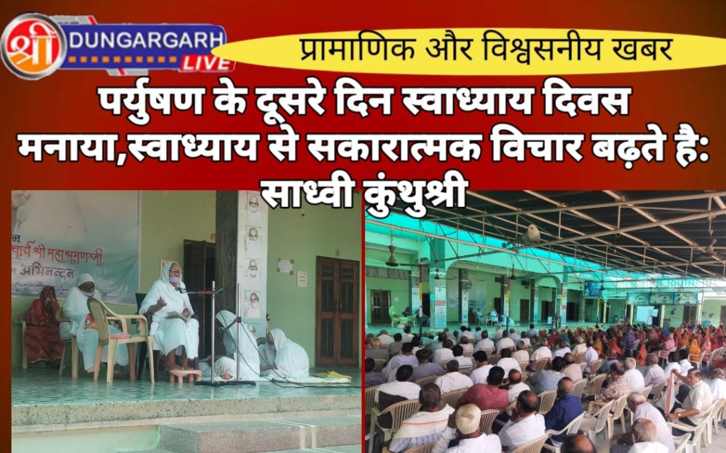 श्रीडूंगरगढ़। पर्युषण महापर्व के दूसरे दिन स्वाध्याय दिवस श्रीडूंगरगढ़ सेवा केंद्र में मनाया गया। सेवा केंद्र व्यवस्थापिका शासनश्री साध्वी कुंथुश्री ने उपस्थित श्रावक श्राविका समाज को कहा कि पर्वाधिराज पर्युषण आत्मावलोकन का पर्व है। आत्मा के विषय में अनुप्रेक्षा, चिंतन और मनन करना स्वाध्याय है। मर्यादा पूर्वक स्वाध्याय करना स्वाध्याय है। स्वाध्याय करने से ज्ञान का विकास होता है। नए-नए ज्ञान रत्न प्राप्त होते हैं।स्वाध्याय से जहां ज्ञानावरणीय कर्म क्षीण होते हैं वही मानसिक संबल प्राप्त होता है। स्वाध्याय एक ऐसा दर्पण है इससे व्यक्ति अपने भीतर और बाहर देख सकता है और नकारात्मक भाव को दूर कर सकता है। साध्वी ने कहा कि स्वाध्याय से व्यक्ति का दृष्टिकोण सकारात्मक होता है और भाव में पवित्रता आती है। साध्वी की प्रेरणा से उपस्थित समाज ने स्वाध्याय दिवस पर समय अनुसार स्वाध्याय करने का संकल्प लिया। कार्यक्रम में साध्वी सुमंगलाश्री, साध्वी जीतयशा, साध्वी संपतप्रभा जी स्वाध्याय दिवस पर भावपूर्ण अभिव्यक्ति दी।तेरापंथ युवक परिषद द्वारा अभिनव सामायिक के बैनर का विमोचन किया गया।