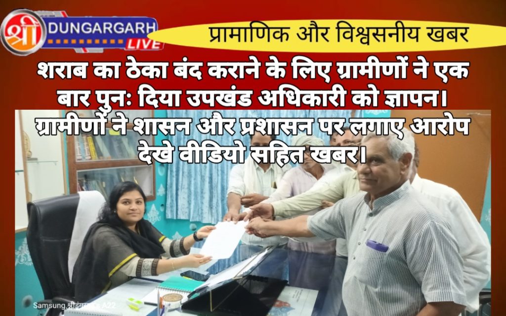श्रीडूंगरगढ़ के ग्राम धीरदेशर चोटियां के ग्रामीणों ,सरपंच ,पूर्व सरपंच ने मिलकर एक बार पुनः गांव में शराब के ठेके को बंद करवाने के लिए उपखंड अधिकारी को दिया ज्ञापन। सरपंच रामचंद्र चोटिया ने बताया की एक शराब का ठेका पिछले कुछ समय से सञ्चालित है जो की ग्राम पंचायत की आबादी क्षेत्र में तथा स्कूल एव स्कूल के खेल मैदान की 50 मीटर की परिधि में आता है। ठेकेदार को कई बार बन्द करने हेतु पाबंद किया जा चूका है। तथा उच्चअधिकारियो को सूचित किया जा चुका है। अगर ठेका बंद नही होता है तो ग्राम पचायत में धरना प्रदर्शन किया जायेगा तथा समस्त शिक्षण संस्थान एवं ग्राम की दुकानें बन्द करवा कर प्रदर्शन किया जाएगा। ग्रामीणों ने चेतावनी देते हुवे बताया की इस बार अगर कोई ठोस करवाई नही हुई तो धरना प्रदर्शन एव पंचायत की सभी जरूरत सस्था बन्द की जायेगी जिसके जिम्मेदार प्रशासन रहेगा ।ऐडवोकेट श्याम सुंदर आर्य ,वर्तमान सरपंच रामचंद्र चोटिया, पूर्व सरपंच बजरंग लाल चोटिया ,कुशलाराम बारोटिया, तेजाराम मेघवाल, प्रभु राम चोटिया ,सीताराम चोटिया ,नाथू सिंह कुंडलिया ,रामचंद्र मेघवाल ,किशन लाल जाट ,श्याम सुंदर सारण, गजानंद शर्मा, लालचंद साहू ,सहीराम जाट ,भूतपूर्व सरपंच प्रतिनिधि नारायण मेघवाल ,धनाराम मेघवाल, करणाराम मेघवाल और बड़ी संख्या में ग्रामीण मौके पर रहे।