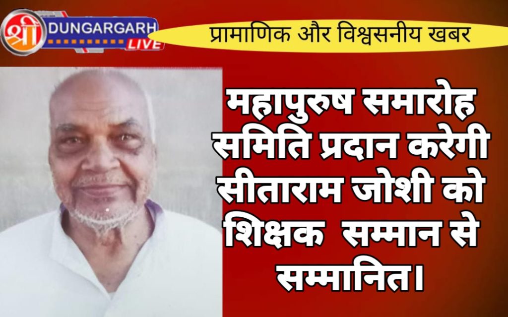 महापुरुष समारोह समिति ने इस वर्ष का शिक्षक सम्मान 2024 सेवानिवृत्त शिक्षक श्री सीताराम जोशी श्रीडूंगरगढ़ को देने का निर्णय किया है । पुरस्कार चयन कमेटी के सदस्य बजरंगलाल सेवग ने इसकी घोषणा की है । संस्था के अध्यक्ष श्रीगोपाल राठी ने बताया कि श्री जोशी ने अपने सेवाकाल में एक आदर्श शिक्षक के रुप मे सेवाएं दी । आज भी शिष्य वर्ग में इनकी कर्तव्यनिष्ठा एवं ईमानदारी की अलग छाप है । संस्था के मंत्री सुशील सेरडिया ने बताया कि आगामी 6 सितम्बर को महाराणा प्रताप पब्लिक स्कूल श्रीडूंगरगढ़ में संस्था द्वारा आयोजित कार्यक्रम में श्री सीताराम जोशी को शिक्षक सम्मान 2024 से सम्मानित किया जाएगा । संस्था द्वारा आयोजित होने वाले इस समारोह के मुख्य अतिथि- साहित्यकार श्याम महर्षि, विशिष्ट अतिथि गजानन्द सेवग जिला शिक्षा अधिकारी बीकानेर एवं महाराणा प्रताप पब्लिक स्कूल के प्रधानाचार्य भगत सिंह धनखड़, मुख्यवक्ता- डॉ मदन सैनी साहित्यकार होंगें ।