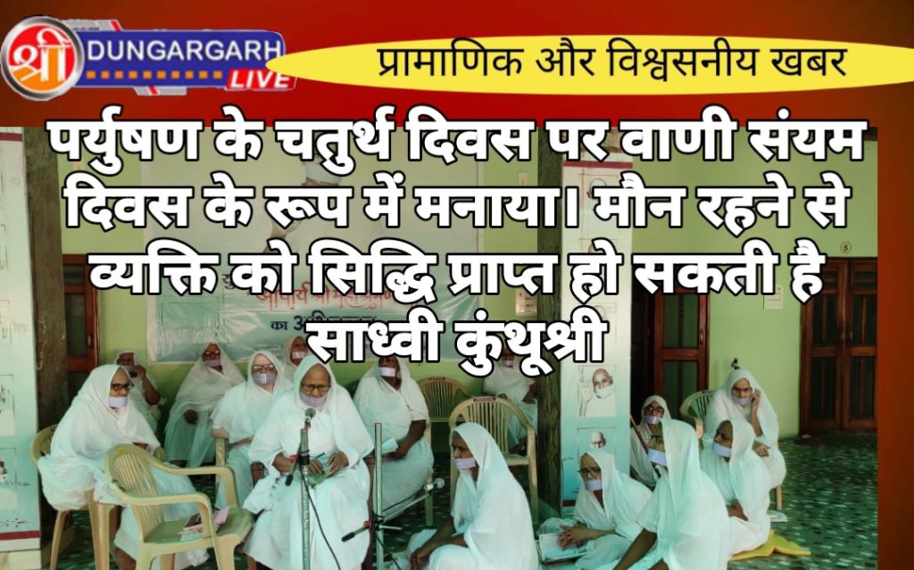 श्रीडूंगरगढ़। पर्युषण महापर्व के चतुर्थ दिवस को वाणी संयम दिवस के रूप में श्रीडूंगरगढ़ सेवा केंद्र में मनाया गया। सेवा केंद्र व्यवस्थापिका शासनश्री साध्वी कुंथुश्र ने उपस्थित श्रावक श्रविका समाज को वाणी संयम की महत्ता बताते हुए फरमाया की5 मौन सोना है । 12 वर्ष मौन करने से व्यक्ति को सिद्धि प्राप्त हो सकती है।मौन से ऊर्जा का संचार होता है। मौन विश्राम है। हर समय मौन करना संभव नहीं है, बोलना भी आवश्यक है। कब बोलें, कैसे बोलें, कितना बोलें इन सब का प्रशिक्षण अवश्य लें। साध्वी ने समझाते हुए कहा कि हर व्यक्ति तीन फैक्ट्री अवश्य खोलें; मस्तिष्क में आइस फैक्ट्री, जुबान में शुगर फैक्ट्री और हृदय में लव फैक्ट्री ताकि लड़ाई झगड़े से बचा जा सके।कार्यक्रम में साध्वी सरसप्रभा ने “मधुर भाषी बनना होगा” गीत का सुमधुर संगान किया। साध्वी ललितरेखा और सुमंगलाश्री ने वाणी संयम दिवस पर अपने सारगर्भित विचार रखें।