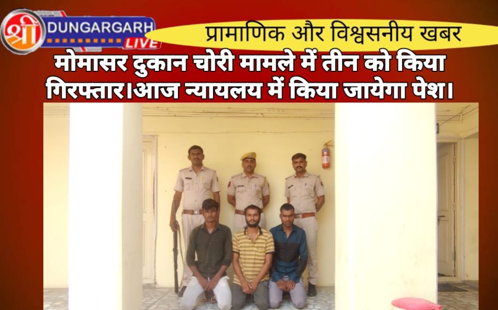 मोमासर गांव में हुई चोरी मामले में आज तीन आरोपियों को गिरफ्तार करके न्यायलय में भेजगे । हेड कांस्टेबल देवाराम से मिली जानकारी के अनुसार मोमासर गांव में हुई चोरी के मामले में पुलिस ने राजूराम पुत्र नोरंगराम नायक भाउदेशर पुलिस थाना राजलदेशर हाल निवासी मोमासर, बाबूलाल पुत्र बिश्नाराम नायक मोमासर, रतन लाल पुत्र हनुमान बावरी मोमासर को गिरफ्तार किया गया है जिनको आज कोर्ट में पेश किया जायेगा और रिमांड मांगा जाएगा।पुलिस टीम के हेड कांस्टेबल देवाराम कांस्टेबल नरेंद्र सिंह,राजबीर ढाका, अनिल कुमार दायमा की टीम द्वारा इस कार्रवाई को अंजाम दिया गया।