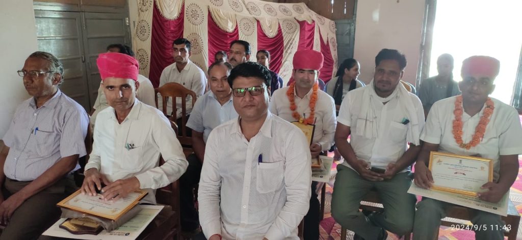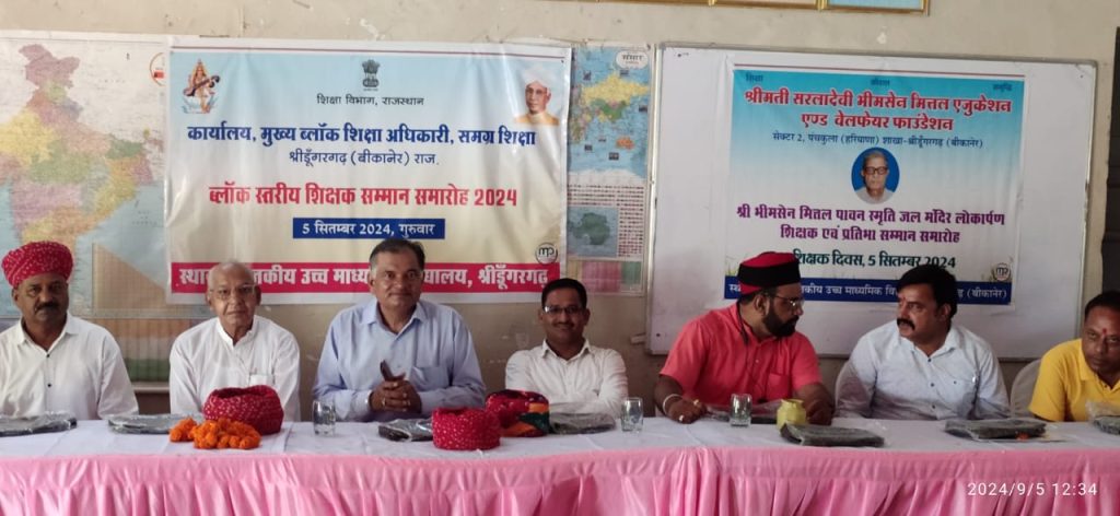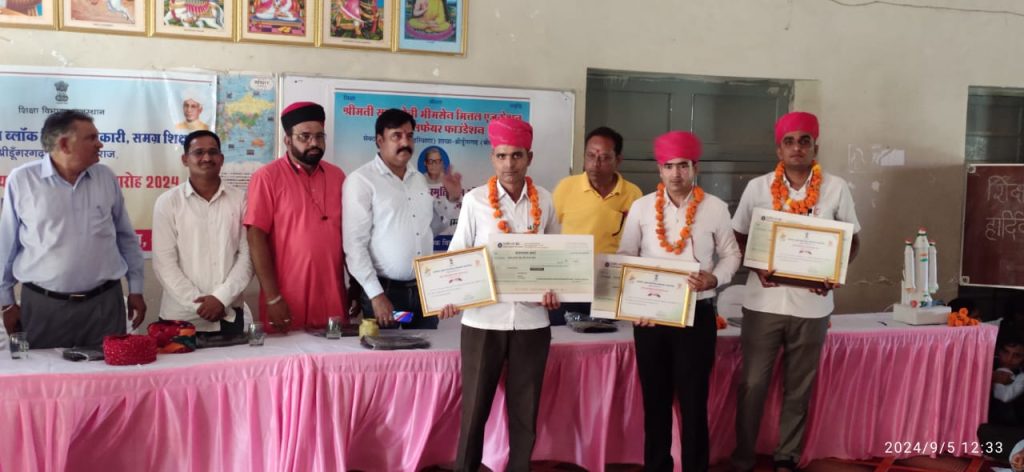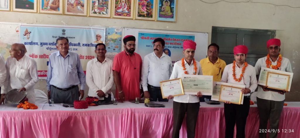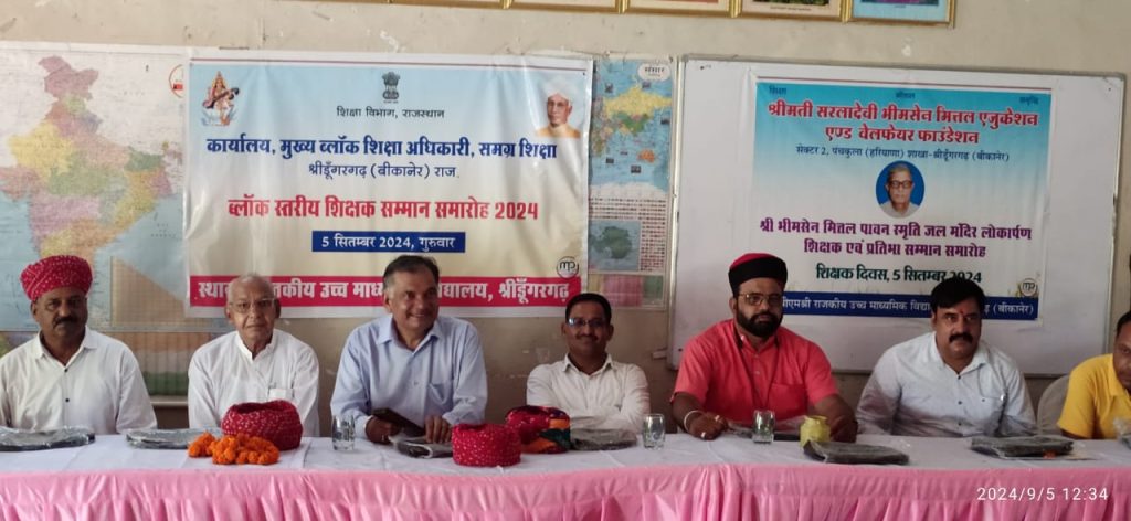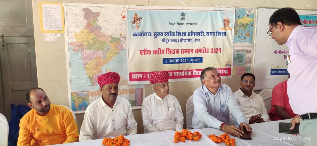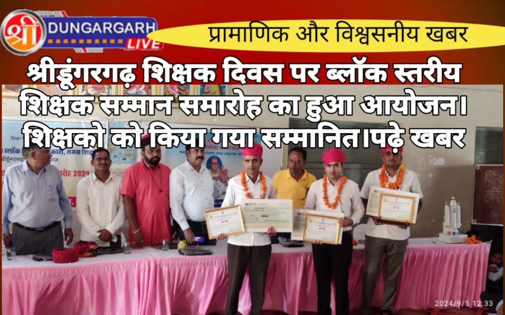 शिक्षक दिवस के उपरांत आज शिक्षकों का किया ब्लॉक स्तरीय सम्मान।राकीय उच्च माध्यमिक विद्यालय श्रीडूंगरगढ में ब्लॉक स्तरीय शिक्षक सम्मान समारोह का आयोजन किया गया जिसमें ब्लॉक श्रीडूंगरगढ़ में तीन कक्षा वर्गों के उच्च वरीयता वाले तीन शिक्षकों का साफा, सोल, प्रशस्ति-पत्र, स्मृति चिन्ह व 5100 रूपये नकद राशि देकर सम्मानित किया गया। कक्षा वर्ग (9-12) में श्री हेतदास स्वामी, प्राध्यापक राउमावि बींझासर, कक्षा वर्ग (6-8) में श्री भंवरलाल शर्मा, अध्यापक राउमावि धोलिया, कक्षा वर्ग (1-5) में श्री रामकरण डोटासरा, अध्यापक श्री क. ला. सि. राउमावि श्रीडूंगरगढ का स्वागत और सम्मान किया गया। कार्यक्रम में श्री ओमप्रकाश प्रजापत सी.बी.ई.ओ, श्री ईश्वरराम गरुवा ए.सी.बी.ई. ओ, श्री लीलाधर शर्मा से.नि. प्राचार्य, श्री ताराचन्द इन्दौरियासमाज सेवी, श्री उमाशंकर सारण प्राचार्य, श्री पवन कुमार शर्मा उपप्राचार्य, भामाशाह श्री अनुराग जी मित्तल उपस्थित रहें। आयोजक विद्यालय के प्राचार्य श्री मनीष सैनी, व.अ. डॉ राधा कृष्ण सोनी उपस्थित रहे। मंच संचालन श्री मदन जी कडवासरा प्राध्यापक ने किया। श्री भीमसेन मित्तल की स्मृति में यूसीईईओ श्रीडूंगरगढ परिक्षेत्र के तीन विद्यालयों के विद्यार्थियों व शिक्षकों को सम्मानित किया गया।
