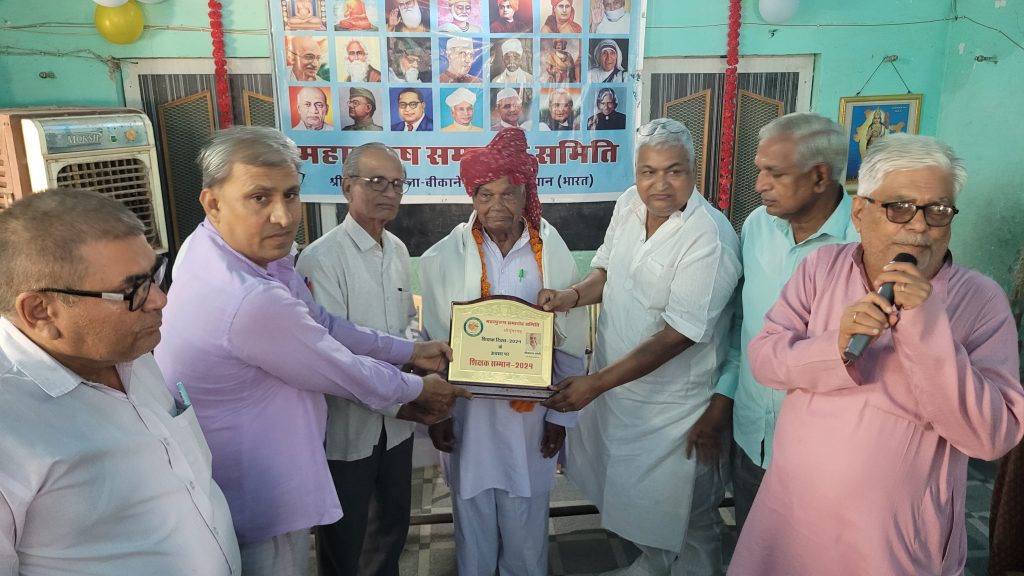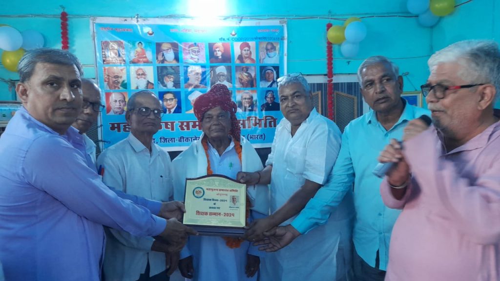 महापुरुष समारोह समिति द्वारा शुक्रवार को शिक्षक सम्मान समारोह आयोजित किया गया। महाराणा प्रताप सी सै स्कूल श्री डूंगरगढ़ में आयोजित इस समारोह में साहित्यकार श्याम महर्षि मुख्य अतिथि के रूप में मोजूद रहे , श्रीगोपाल राठी ने कार्यक्रम की अध्यक्षता की। कार्यक्रम में विशिष्ट अतिथि के रूप में भगतसिंह धनखड़ प्रधानाचार्य महाराणा प्रताप पब्लिक स्कूल श्रीडूंगरगढ़ एवं मुख्य वक्ता के रूप में साहित्यकार डॉ मदन सैनी मोजूद रहे। अतिथियों द्वारा डॉ राधाकृष्णन के चित्र पर माल्यार्पण एवं दीप प्रज्वलन कर कार्यक्रम की शुरुआत की गई। शाला की छात्राओं ने सरस्वती वंदना एवं स्वागत गीत की प्रस्तुति दी । कार्यक्रम में प्रेरणादायक व्यक्तित्व श्री सीताराम जोशी सेवानिवृत्त व्याख्याता श्रीडूंगरगढ़ को अपने जीवनकाल में शिक्षक के रूप में उत्कृष्ट सेवाओं के लिए संस्था की ओर से साफा , शॉल एवं प्रशस्तिका प्रदान कर शिक्षक सम्मान से अलंकृत किया गया । कार्यक्रम में मुख्य अतिथि श्याम महर्षि ने कहा कि शिक्षक राष्ट्र एवं समाज के विकास की मुख्य धुरी है ,ये विकास को मजबूत करते है, इनके कार्य सभी के लिए प्रेरणास्रोत होते है । महर्षि ने शिक्षकों एवं विद्यार्थियों को समाज एवं राष्ट्रहित में कड़ी मेहनत करने का सन्देश दिया । मुख्यवक्ता डॉ मदन सैनी ने कहा कि डॉ राधाकृष्णन विश्व के महान व्यक्तित्व थे ,उन्होंने भारतीय सभ्यता एवं संस्कृति को विश्व पटल पर स्थापित किया । सैनी ने डॉ राधाकृष्णन के दर्शन पर व्याख्यान दिया । सीताराम जोशी ने संस्था का सम्मान के लिए आभार प्रकट करते हुए कहा कि आज बच्चों को कड़ी मेहनत एवं अनुशासन में रहकर स्वाध्याय की सीख दी । संस्था के मंत्री सुशील सेरडिया ने स्वागत भाषण देते हुए संस्था गतिविधियों की जानकारी दी । संस्था अध्यक्ष श्रीगोपाल राठी ने आभार प्रकट करते हुए कहा कि संस्था शिक्षा एवं स्वास्थ्य के क्षेत्र में सुधार हेतु निष्ठापूर्वक कार्य कर रही है । राठी ने कहा कि संस्था शीघ्र ही राष्ट्र एवं समाज हितेषी नई रचनात्मक गतिविधियां प्रारम्भ करेगी । इस अवसर पर एडवोकेट श्याम सुंदर आर्य, तुलसीराम चोरड़िया, जगदीश मूंधड़ा, भंवरलाल भोजक, बजरंगलाल सेवग, जगदीश स्वामी,रामकिशन राठी, निर्मल पुगलिया, शुभकरण पारीक, विजयराज सेवग, विमल भाटी, विजय महर्षि, मनोज डागा, ललित बाहेती, जगदीश भाम्भू, कुम्भाराम घिंटाला , राजेश शर्मा, रमेश व्यास, सुरेश भादानी, अशोक पारीक सहित शहर के गणमान्य लोग एवं बच्चे उपस्थित रहे । कार्यक्रम का संचालन सत्यदीप ने किया ।