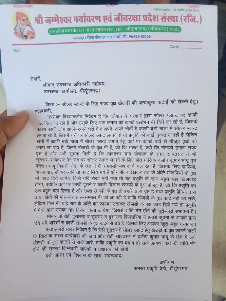 सोलर प्लांट की कंपनियों द्वारा अंधाधुंध राज्य वक्ष खेजड़ी के पेड़ों की कटाई की रोकथाम के लिए आज तहसील के पर्यावरण प्रेमियों में दिखाओ भारी रोज एसडीएम साहबा को ज्ञापन व वन विभाग रेंजर साहब को ज्ञापन सोपा जिसमें मूलाराम भादू प्रदेश महासचिव पीसीसी अध्यक्ष रामरतन हरलाल रायचंद निहालचंद शंकर लाल रामनिवास पत्रकार शुभकरण मोहनलाल कैलाश रतनलाल मेघवाल बंसीलाल श्याम सुंदर मांगीलाल रामकुमार मांगीलाल गोपाल मनोज कुमार सुभाष रामसागर जगदीश धारणिया सीताराम महेंद्र आदि।सभी ने उपखंड अधिकारी से ग्वार लगाई है कि एक भी पेड़ तहसील में ना कटे छत्तीकोम के पर्यावरण प्रेमियों में भारी रोशन है पर्यावरण एवं जीव रक्षा के तहसील अध्यक्ष शिव कैलाश बिश्नोई ने बताया कि अगर ईसी तरह से पेड़ काटते रहे तो धरती पर मानव जीवन समाप्त हो जाएगा और समय रहते इस पर अंकुश नहीं लगा तो उग्र आंदोलन की चेतावनी भी दी है