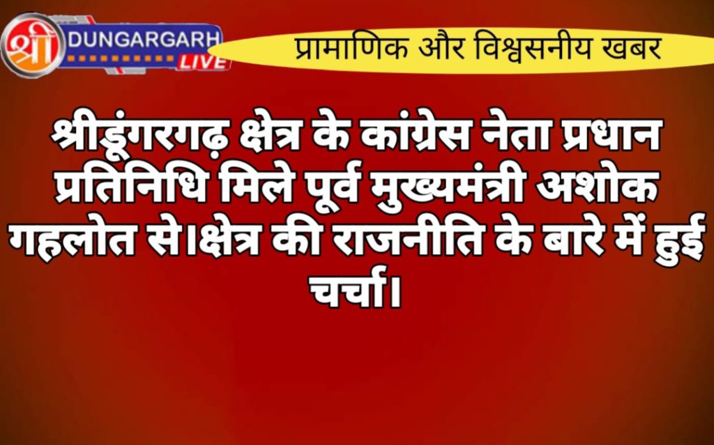 क्षेत्र में कांग्रेस की अंदरूनी राजनीति खासी गर्माई हुई है। क्षेत्र के कांग्रेसी नेता एवं प्रधान प्रतिनिधि केशराराम गोदारा ने जयपुर में पूर्व मुख्यमंत्री अशोक गहलोत से शिष्टाचार मुलाकात की। इस दौरान गोदारा ने उनके स्वास्थ्य के बारे में जानकारी ली एवं उनके मुख्यमंत्री कार्यकाल के दौरान श्रीडूंगरगढ़ क्षेत्र में करवाए गए विकास कार्यों के लिए क्षेत्र की जनता की और से आभार जताया। गोदारा ने गहलोत द्वारा चलाई गई सामाजिक कल्याण और विकास कार्यों को राज्य के लिए ऐतिहासिक एवं यादगार बताया। इस दौरान क्षेत्र की राजनीतिक स्थिति पर विस्तार से चर्चा की गई और भविष्य की रणनीतियों पर विचार-विमर्श किया गया। इस दौरान गहलोत ने पार्टी को मजबूत करने को कहा।