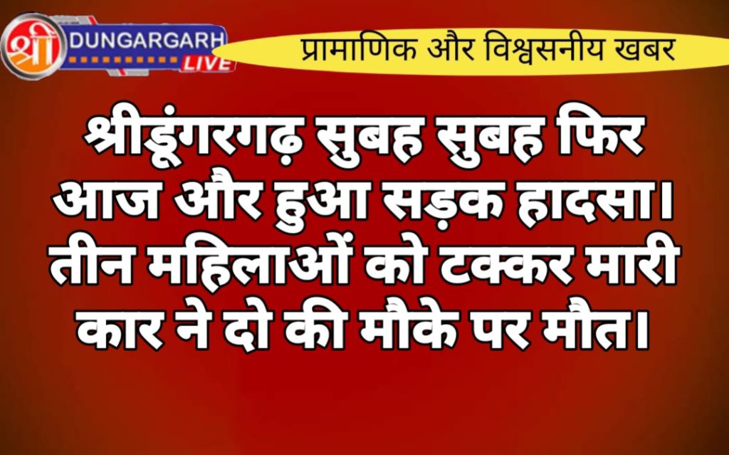 सुबह-सुबह बड़ी ही दर्दनाक खबर निकलकर सामने आ रही है जहां श्रीडूंगरगढ़ से तोलियासर पैदल जा रही महिला यात्रियों को एक कार ने कुचल दिया ।पुलिस से मिली जानकारी के अनुसार कांकड़ भेरूजी मंदिर से पहले स्टेट हाईवे पर तीन महिलाओं को एक कार ने टक्कर मार दी जिसमें दो की मौके पर ही मौत हो गई जबकि एक महिला गंभीर रूप से घायल हो गई जिसको ट्रॉमा सेंटर भेजा गया है। घटना की जानकारी मिलने पर 112 टीम के साथ हेड कांस्टेबल भगवान राम मौके पर पहुंचे और मामले की जांच कर रहे हैं वहीं थाना अधिकारी इंद्र कुमार भी घटनास्थल पर पहुंच चुके हैं। मिली जानकारी के अनुसार सभी श्रद्धालु श्रीडूंगरगढ़ से तोलियासर पैदल जा रहे थे और तेज रफ्तार कार उनको टक्कर मार दी।
