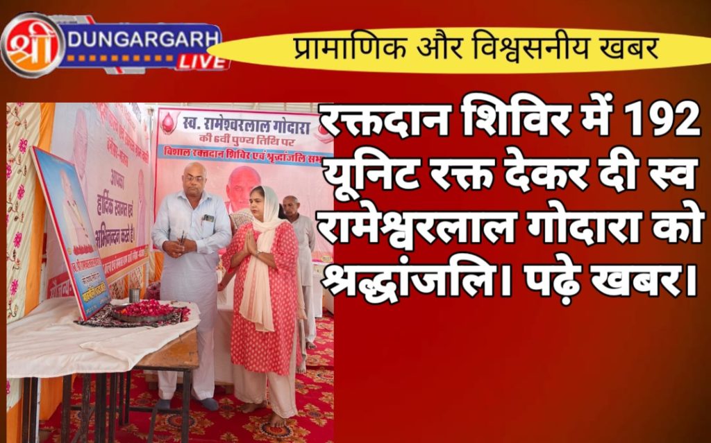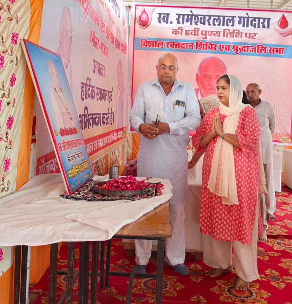 आज स्व रामेश्वर लाल जी गोदारा की 6वी पुण्यतिथि 192 यूनिट देकर दी श्रदाजली । जिसमे से 6 महिलाए और बाकी पुरुषो ने रक्त दान किया मुख्य अतिथि के रूप में प्रधान प्रतिनिधि केशराराम गोदारा ,हरीराम बाना ,सोहन महिया, लखासर सरपंच गोरधन खिलेरी ,रामनारायण नोखा, श्रवण सिंह भोजास आदि उपस्थित रहे।:कार्यकर्ता के रूप में सरपंच प्रतिनिधि के रूप में बीरबल गोदारा ,ओमप्रकाश डोगीवाल ,हेतराम गोदारा,नारायण राम गोदारा मोजूद रहे।