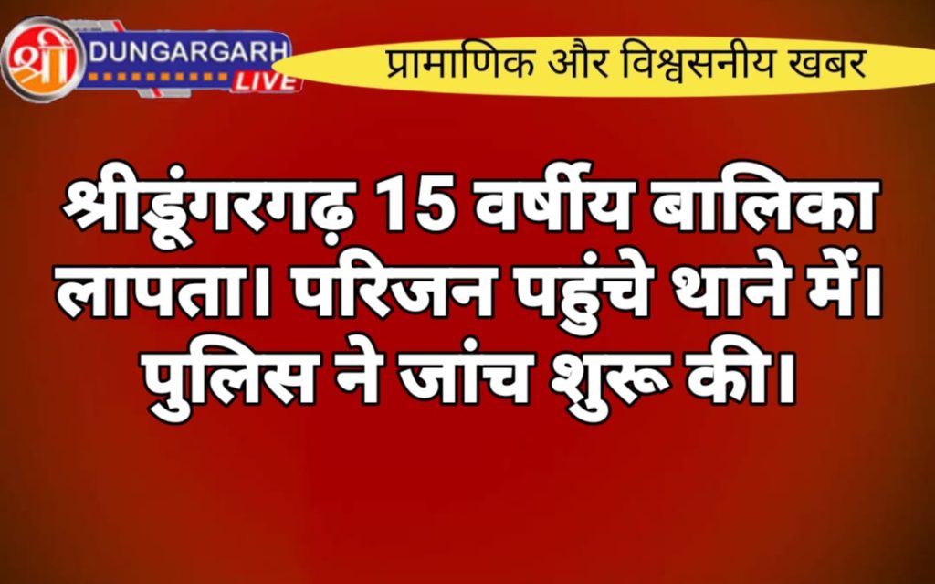 श्रीडूंगरगढ़ क्षेत्र के गांव से 15 वर्षीय बालिका के रात्रि के समय घर से लापता होने की घटना सामने आई है। बालिका के दादा द्वारा श्रीडूंगरगढ़ पुलिस थाने में दी गई शिकायत के अनुसार उनके भाई की 15 वर्षीय पोती रात को खाना खोकर घर में सोई थी लेकिन सुबह घर पर नहीं मिली फिलहाल पुलिस ने मुकदमा दर्ज दर्ज कर दिया है और मामले की जांच शुरू कर दी गई है।