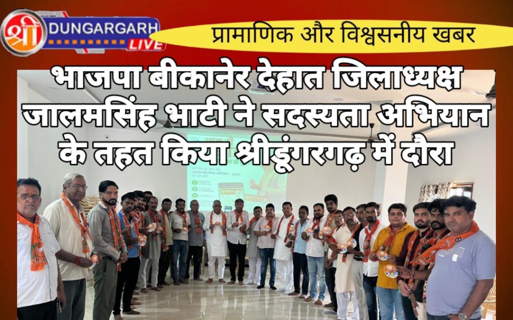 भारतीय जनता पार्टी जिलाध्यक्ष जालमसिंह भाटी ने सदस्यता अभियान 2024 के अन्तर्गत श्रीडूंगरगढ़ में जन सम्पर्क दौरे के दौरान पार्टी पदाधिकारियों जनप्रतिनिधियों को सक्रियता के साथ कार्य को गति देकर ज्यादा से ज्यादा संख्या में भाजपा सदस्यता अभियान के तहत सदस्यों को ऑनलाइन जोड़ने के लिए प्रेरित किया। इस दौरान जिलाध्यक्ष भाटी के साथ किसान मोर्चा जिलाध्यक्ष भंवरलाल जांगिड़,जिला महामंत्री सवाई सिंह तंवर,जिला महामंत्री श्याम पंचारिया ने भी कार्यकर्ताओं को सक्रियता सदस्यता अभियान को चलाने के लिए कहा । इस बीच जन सम्पर्क के दौरान मौजूद रहे चेयरमैन मानमल शर्मा,जिला उपाध्यक्ष शिव स्वामी,मांगीलाल राठी, एस कुमार सिंधी,पार्षद जगदीश गुर्जर,मुलचंद इंदोरिया,नरेश मोट,पार्षद पवन उपाध्याय,लोकेश गौड़,राम सिंह जागीरदार,विक्रम सिंह,भवानी प्रकाश तावणीयां, ओम प्रकाश नाई,सांवरमल शर्मा, महेन्द्र सिंह,फतेहसिंह जांगिड़,प्रिशु स्वामी,कन्हैयालाल शर्मा,किशन पूरी,विष्णु नाई,अर्जुनराम शर्मा,हिमांशु सहित पार्टी कार्यकर्तागण मौजूद रहे ।