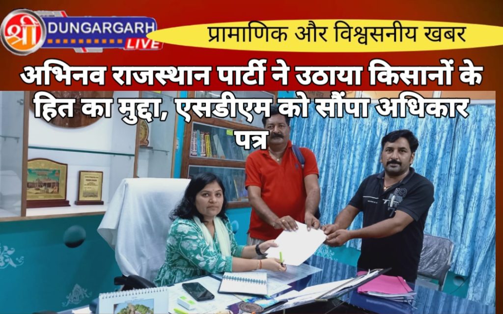 श्रीडूंगरगढ़ एसडीएम उमा मित्तल को अभिनव राजस्थान पार्टी के कार्यकर्ता श्रवणसिंह पुण्दलसर और बलवंत नाई ने लोकसेवा प्रदान करने की गारंटी अधिनियम 2011 के तहत किसानों के हित में ज्ञापन सौंपा। श्रवणसिंह ने एसडीएम को ज्ञापन देते हुए कहा कि राजस्थान के किसानों के लिए जारी फसल बीमा योजना के नियमों को पारदर्शिता से लागू किया जाए। श्रवणसिंह ने कहा कि बीमा कंपनियों का दायित्त्व बनता है कि वह किसानों के घर तक पहुंचे और उनकी फसलों की बीमा करे परन्तु प्रशासनिक उदासीनता के चलते किसानों के बीमा की राशि तो कटती है परन्तु उचित मुआवजा कभी नहीं मिलता। बलवंत नाई ने कहा कि प्रशासनिक अधिकारी किसानों के हित में पटवारी, कृषि अधिकारी को क्षेत्र में भेजें और किसानों के हितों की रक्षा करें। एसडीएम मित्तल ने किसानों के हितों के लिए उचित कदम उठाने का आश्वासन दिया।