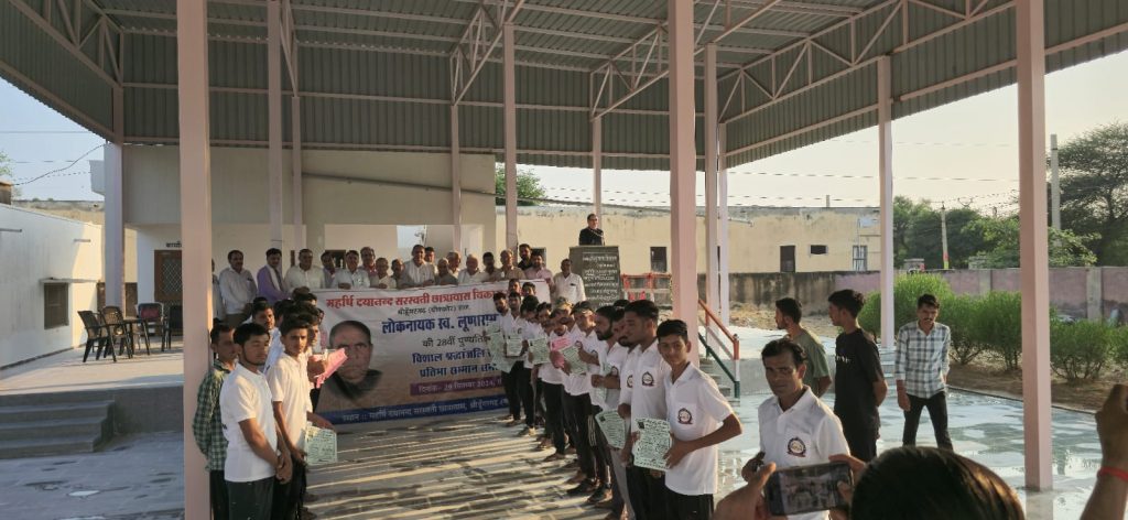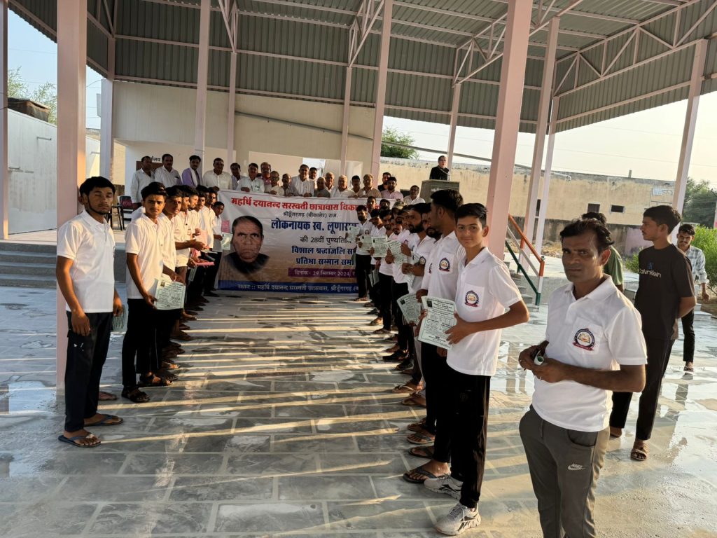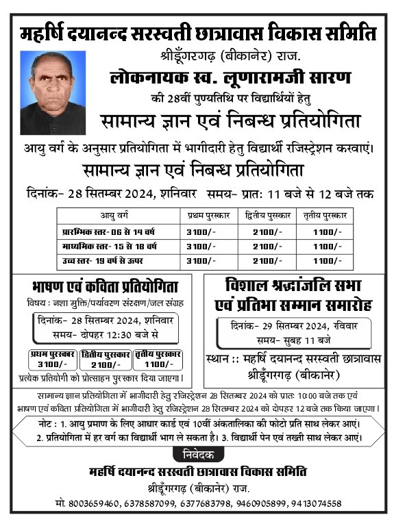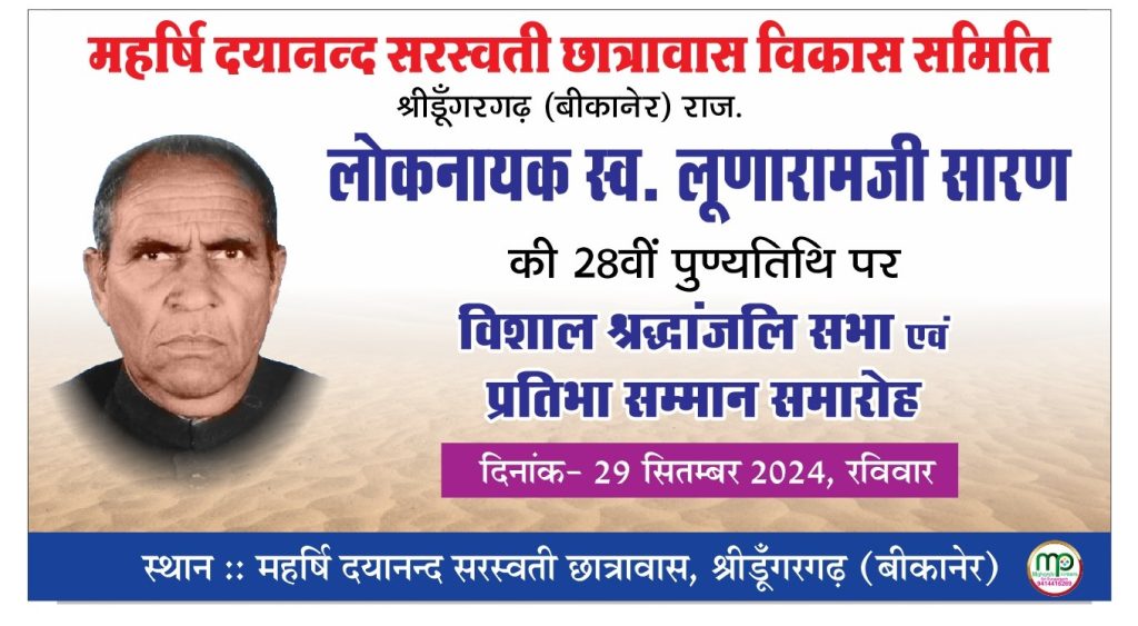 लोकनायक स्वर्गीय लूणाराम जी सारण की 28 वीं पुण्यतिथि के अवसर पर महर्षि दयानन्द सरस्वती छात्रावास श्रीडूंगरगढ़ में आयोजित होने वाली दो दिवसीय गतिविधियों एवं कार्यक्रम के लिए बैनर एवं पोस्टर का विमोचन मैनेजमेंट कमेठी के अध्यक्ष एडवोकेट श्याम सुन्दर आर्य, साहित्यकार श्याम महर्षि, पूर्व जिला प्रमुख मेघाराम महिया, सामाजिक कार्यकर्ता तुलसीराम चोरड़िया, रामचन्द्र राठी, कांग्रेस नेता मूलाराम भादू , मास्टर प्रभुराम बाना, चाँदराम चाहर, शिक्षा अधिकारी ईश्वरराम गरुवा, सरपंच जसवीर सारण, छात्रावास अधीक्षक श्रवण कुमार भामू एवं उपस्थित गणमान्य लोगों द्वारा किया गया । एडवोकेट आर्य ने बताया कि स्वर्गीय लूणाराम जी सारण की पुण्यतिथि के अवसर पर महर्षि दयानन्द सरस्वती छात्रावास स्टेशन रोड़ श्रीडूंगरगढ़ में दो दिवसीय कार्यक्रम होगा । जिसमें 28 सितम्बर को युवाओं एवं छात्रों के बौद्धिक विकास हेतु सामान्य ज्ञान, निबन्ध, कविता एवं भाषण प्रतियोगिता आयोजित होगी एवं 29 सितम्बर को श्रंद्धाजलि सभा एवं प्रतिभा सम्मान समारोह आयोजित होगा जिसमें क्षेत्र के सभी वर्गो के विद्यार्थियों की भागीदारी रहेगी । जिसमें आयु वर्ग के अनुसार आयोजित प्रतियोगिता में प्रथम, द्वितीय एवं तृतीय स्थान प्राप्त प्रतिभाओं को प्रशस्ति पत्र, मोमेंटो एवं नगद राशि पुरस्कार प्रदान कर सम्मानित किया जाएगा । सुशील सेरडिया ने बताया कि 28 सितम्बर को आयोजित सामान्यज्ञान एवं निबन्ध प्रतियोगिता में आयु वर्ग के अनुसार – प्रारंभिक स्तर 6 से 14 वर्ष, माध्यमिक 15 से 18 वर्ष, उच्च स्तर 19 वर्ष से अधिक के विद्यार्थी 28 सितम्बर को प्रातः 10 बजे तक आधार कार्ड एवं अंक तालिका दिखाकर विद्यार्थी अपना रजिस्ट्रेशन करवा सकते है । भाषण एवं कविता प्रतियोगिता के लिए 28 सितम्बर को दोपहर 12 बजे तक रजिस्ट्रेशन करवा सकते है । इस अवसर पर कुम्भाराम घिंटाला, लक्ष्मीनारायण भादू, हंसराज गोदारा, भंवरलाल सारण, दीनदयाल जाखड़, भंवरलाल जाखड़, रामकिशन गावड़िया, श्याम सारण, हरिराम पुनियाँ, मुकेश गोदारा, रामकृष्ण सारण, सुभाष जाखड़, भैराराम लुखा, देवकिशन गोदारा, शिवलाल गोदारा, चन्द्र बाबु गोदारा, शिवरतन जाखड़, जगराम बाना, किशनलाल सहू, मोहनलाल सारण, रामनिवास डूडी, भागीरथ धतरवाल सहित छात्रावास के छात्र उपस्थित रहे ।