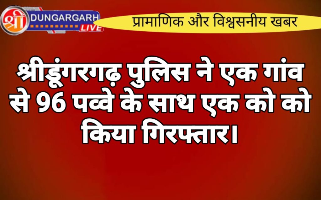 श्रीडूंगरगढ़ पुलिस ने गांव केऊ में एक दुकानदार को 96 में पव्वे के साथ गिरफ्तार किया है। एसआई धर्मवीर की टीम ने गांव केऊ के एक भवानी जनरल स्टोर से 96 पव्वे अवैध शराब के मिले ।इसी गांव के शिवराज सिंह पुत्र भवानी सिंह को गिरफ्तार कर लिया और आगे की जांच एसआई रविंद्र सिंह को शॉप दी है।