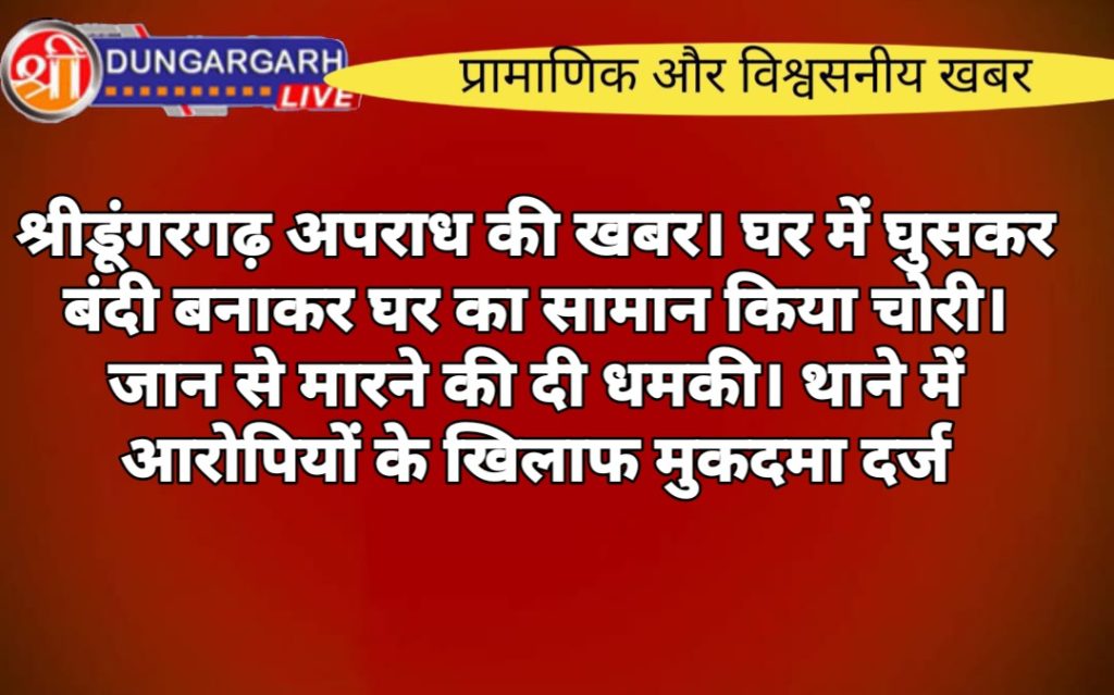 श्रीडूंगरगढ़ थाने में मुकदमा दर्ज करवाते हुवे सुखराम पुत्र मोतीराम जाट निवासी अमर्तवासी ने बताया की मेरे अपने भाइयों ने मेरे घर पर आकर मेरे को बंदी बनाकर घर से समान चोरी कर लिया। पीड़ित ने बताया की आरोपी भाई कालूराम, भतीजा मनफूल और फूसा राम पुत्र चंद्राराम जाट मेरे घर में जबरन घुस कर मेरे हाथ पैर बाध दिए और आरोपी मुझे जान से मारने की कोशिश कर रहे थे और जान से मारने की धमकी भी दी आरोपी मेरे घर से ग्वार मोठ के कट्टे और ट्रेक्टर की बैटरी ,डीजल घर से जबरदस्ती चुरा कर ले गए है परिवादी ने थाने में आपने भाई और भतीजे के खिलाफ मुकदमा दर्ज करवाया और आगे की जांच हेडकोस्टेबल भगवानाराम को शॉप दी।