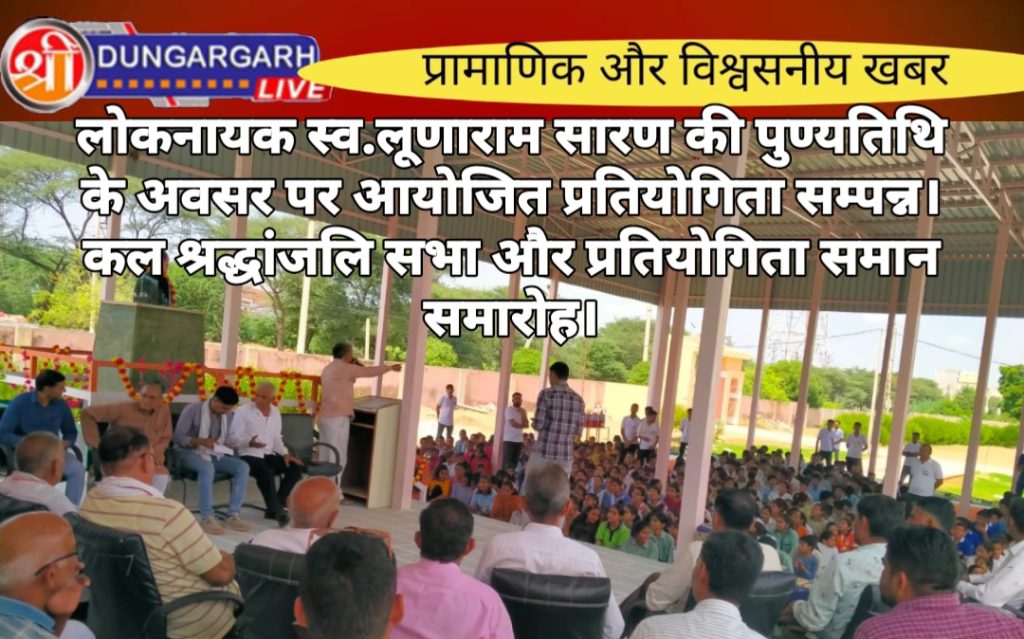 लोकनायक स्व. लूणाराम सारण की 28वीं पुण्यतिथि के अवसर पर पर शनिवार को महर्षि दयानंद सरस्वती छात्रावास में विद्यार्थियों हेतु सामान्य ज्ञान, निबन्ध, भाषण एवं कविता प्रतियोगिता का आयोजन किया गया । सुशील सेरडिया ने बताया कि 448 विद्यार्थियों की भागीदारी रही । छात्रों ने अपनी शैक्षिक दक्षता का प्रदर्शन करते हुए राष्ट्र एवं समाज के ज्वलंत मुद्दों पर अपनी प्रस्तुतियां दी । प्रतियोगिता में अव्वल विद्यार्थियों को 29 सितम्बर को आयोजित प्रतिभा सम्मान समारोह में पुरस्कृत किया जाएगा । प्रतियोगिता के सफल संचालन में डूंगरराम गोदारा, नोरतमल तावनिया, हरिराम सहू, हंसराज गोदारा, ओमप्रकाश बाना, भींयाराम जाखड़, मनोज लखारा, सीताराम जाट, भंवरलाल मेघवाल, देवीलाल छरंग, नरेश कुमार, रामरतन, अलका परिहार, कैलाश चन्द, लिछमनदास स्वामी की भागीदारी रही । इस अवसर पर ने विद्यार्थियों का उत्साहवर्धन किया । एडवोकेट श्याम सुंदर आर्य, साहित्यकार श्याम महर्षि, लक्षणराम खिलेरी, डॉ चेतन स्वामी, मास्टर प्रभुराम बाना, चाँदराम चाहर, करणीसिंह बाना, रामचन्द्र गीला, गोपाल गोदारा, कुम्भाराम घिंटाला, जसवीर सारण, चरणसिंह सारण, हरिराम सारण, भंवरलाल जाखड़,मोहनलाल सारण, श्रीकृष्ण सिद्ध आदि ने बच्चों का उत्साहवर्धन किया । छात्रावास अधीक्षक श्रवण कुमार भाम्भू ने सभी का आभार प्रकट किया ।