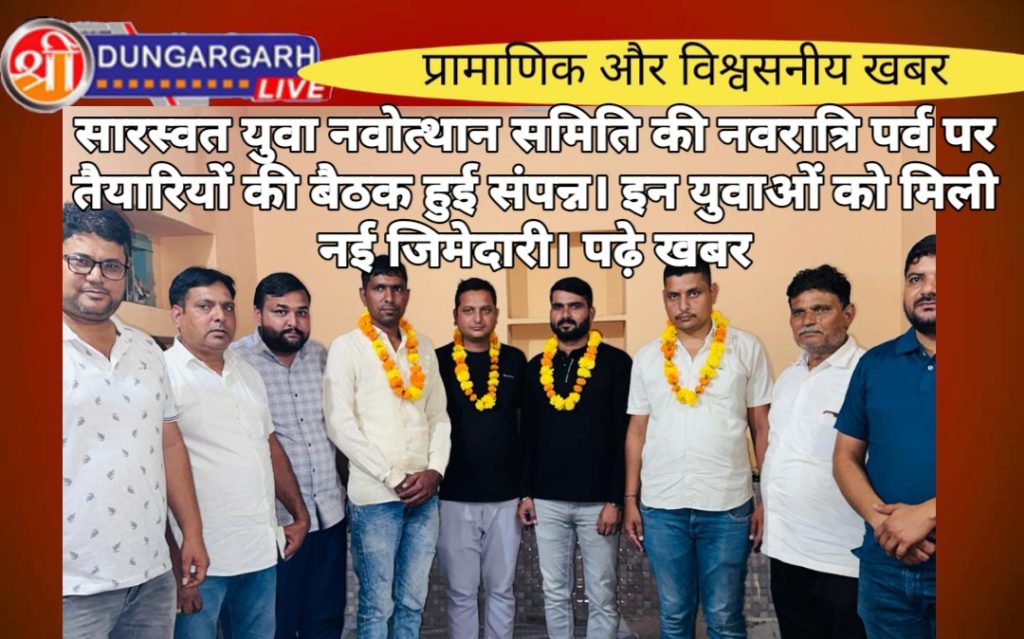 सारस्वत युवा नवोत्थान समिति की नवरात्रा पर्व की पूर्व तेयरियों की बैठक आज दिनांक 29 जुलाई 2024 को सारस्वत भवन में संपन्न हुई ।सारस्वत युवा नवोत्थान समिति की बैठक में उपस्थित सभी जनों ने नयी कार्यकारिणी की घोषणा करते हुए अध्यक्ष पद पर दामोदर सारस्वा आड़सर बास को नियुक्त किया गया।कोषाध्यक्ष हेमंत सारस्वत और मंत्री पद पर पत्रकार पवन सारस्वत (उदरासर) को नियुक्त किया । सह मंत्री के रूप में मनोज कायल को नियुक्त किया गया । 9 दिन चलने वाले नवरात्रि महोत्सव में प्रसाद वितरण का सहयोग रतनलाल सारस्वा कल्याणसर द्वारा किया गया। बैठक में सारस्वत युवाओं में रमेश तावानिया रिड़ी, जयचंद कायल, राजेश शर्मा, गोरीशंकर गुसाइसर, ललित मोट आदि उपस्थित रहे।