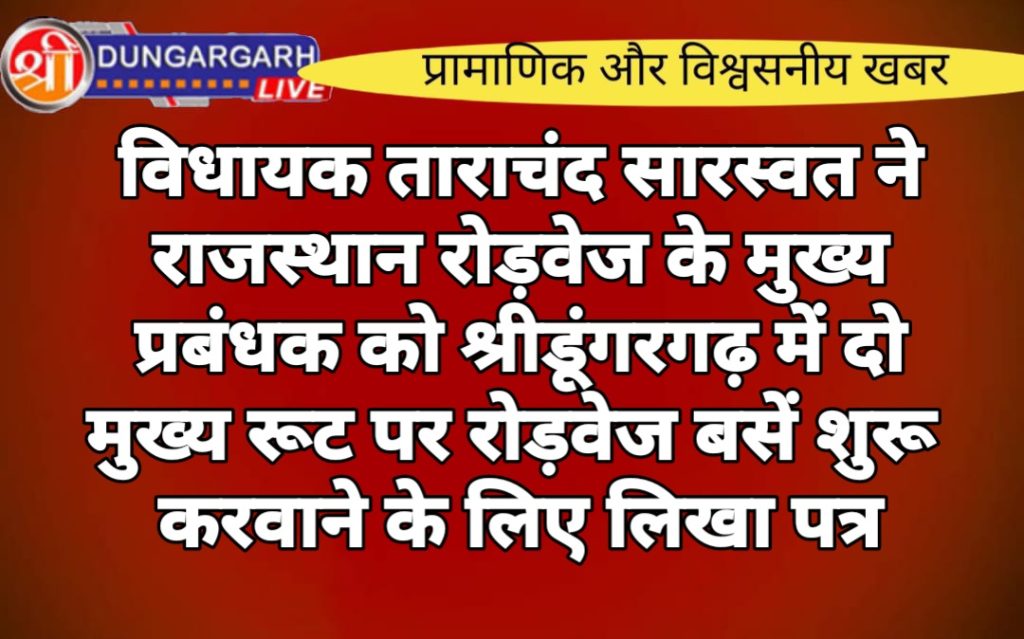 श्रीडूंगरगढ़ से सुजानगढ़ मार्ग एवं श्रीडूंगरगढ़ से लूणकरणसर मार्ग पर राजस्थान सरकार की रोड़वेज बस सुविधा शुरू करवाने के लिए विधायक ताराचंद सारस्वत ने मुख्य प्रबंधक को पत्र के माध्यम से बताया की बीकानेर से खाटूश्यामजी तक रोड़वेज बस की मांग आमजन द्वारा बार-बार उठाई जा रही है | बीकानेर से खाटूश्यामजी वाया श्रीडूंगरगढ़,बिदासर,सुजानगढ़,सालासर इस रूट में दो बड़े धार्मिक स्थल सालासर और खाटू श्याम जी श्रीडूंगरगढ के ग्रामीण इलाकों सेरूणा,लखासर, रीड़ी,धर्मास सहित बीदासर,सुजानगढ़ को लेकर राजस्थान रोड़वेज के माध्यम से सीधे जुड़ जायेंगे और राजस्थान रोड़वेज की बस संचालित होने से आमजन को उचित सुविधा मिल सकेगी जिनमें वरिष्ठ नागरिक और महिलाओं को सरकारी रोड़वेज बसों का लाभ मिल सकेगा तथा इस रूट में आमजन एवं श्रद्दालुओं का काफ़ी संख्यां में आवागमन होने की वजह से राजस्थान सरकार की रोड़वेज बसों को भी उचित लाभ मिलेगा | इसी तरह दूसरी रोड़वेज बस श्रीडूंगरगढ़ से लूणकरणसर के लिए संचालित करवाई जाये इस रूट में कालू, गुंसाईसर बड़ा, लोडेरा जैसे ग्रामीण इलाकों के नागरिकगण जो प्रतिदिन श्रीडूंगरगढ़,लूणकरणसर आवागमन करते है उन सभी वरिष्ठ नागरिक,महिलाओं एवं नागरिकगण को उचित लाभ मिल सकेगा | इन दोनों रोड़वेज बसों की सुविधा जल्द से जल्द शुरू करवाने के लिए विधायक सारस्वत ने प्रबंधक से पत्र के माध्यम से कहा । ये दोनों रोड़वेज बस शुरू होने से श्रीडूंगरगढ़ से बिदासर,सुजानगढ़,सालासर,खाटूश्यामजी तथा श्रीडूंगरगढ़ से गुंसाईसर बड़ा,कालू,लूणकरणसर के लिए वरिष्ठ नागरिक, महिलाओं एवं आमजन को उचित सुविधा एवं लाभ मिलेगा ।