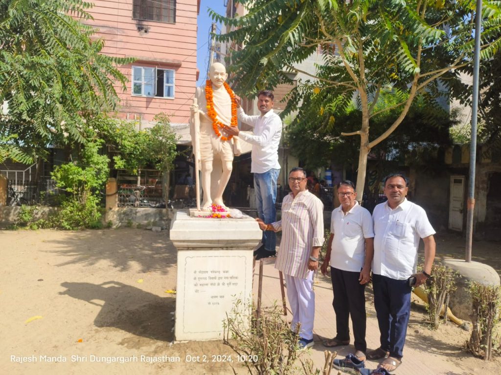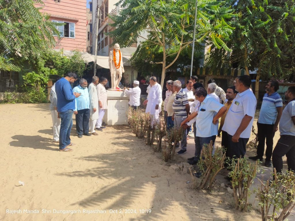 आज श्रीडूंगरगढ़ कांग्रेस कमेटी की ओर से राष्ट्रपिता महात्मा गांधी जीऔर पूर्व प्रधानमंत्री लाल बहादुर शास्त्री जी की जयंती मनाई गई। पूर्व विधायक एवम वरिष्ठ कांग्रेस नेता मंगलाराम जी गोदारा के नेतृत्व में कांग्रेस कार्यकर्ताओं ने गांधी पार्क स्थित महात्मा गांधी की मूर्ति पर माल्यार्पण किया और महात्मा गांधी अमर रहे नारे के साथ पुष्प अर्पित किए।इस अवसर पर प्रदेश कांग्रेस सेवादल महासचिव विमल भाटी, नेता प्रतिपक्ष प्रतिनिधि मनोज पारख,पार्षद अभिषेक चौधरी, संजय करनानी, कमल किशोर नाई, कन्हैयालाल सोमानी, ओमप्रकाश राठी,नोरंग चाहर, सरजीत जाखड़,दीपक गौतम,पार्षद श्याम सुंदर दर्जी, युसूफ खान चुनगर, दाऊद अली काजी, मुनीराम दुसाद, हीरालाल पटवारी, मनोज सोमानी, मनोज सुथार, लालचंद कुकना,मुनीराम दुसाद राजेश मंडा, सोहनलाल महिया, प्रकाश दूसाद, डॉ अयूब खान दमामी, रमेश बासनीवाल, राजू माली, शिवरतन फुलभाटी, सुगनाराम साहू, दीपक माली, हारुण खान, चंपाराम रैगर राकेश सिद्ध,सहित अनेक कार्यकर्ता उपस्थित रहे।