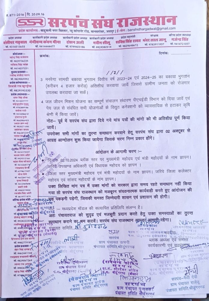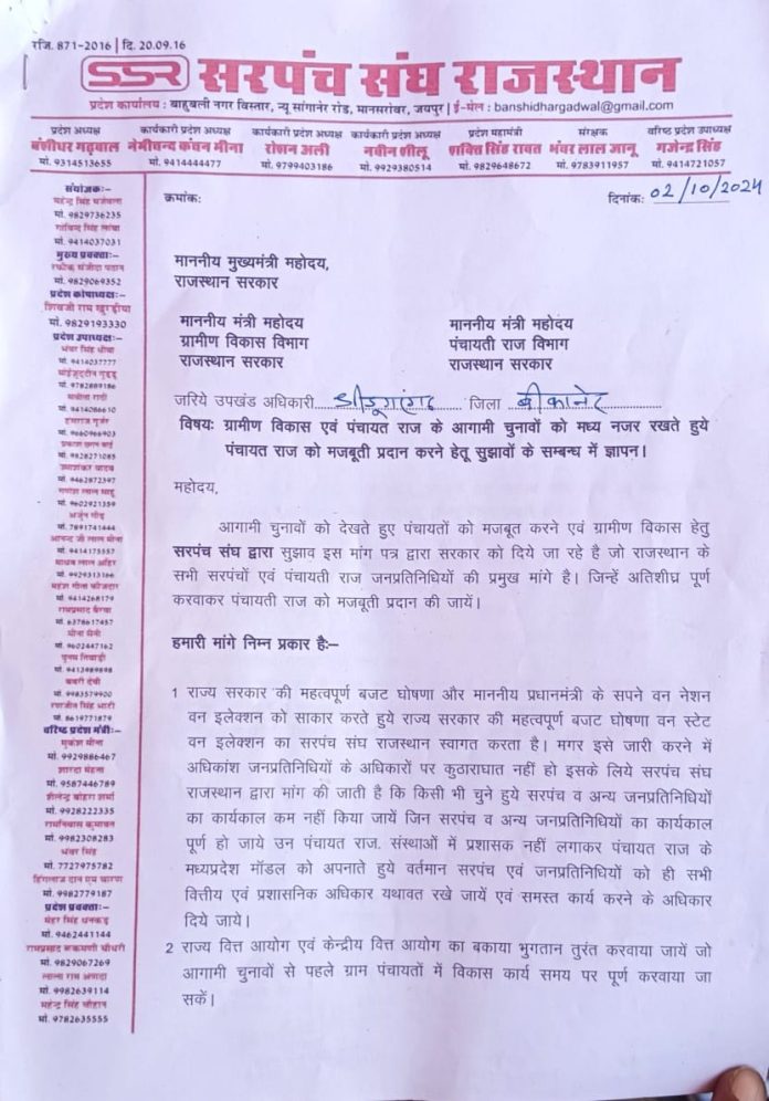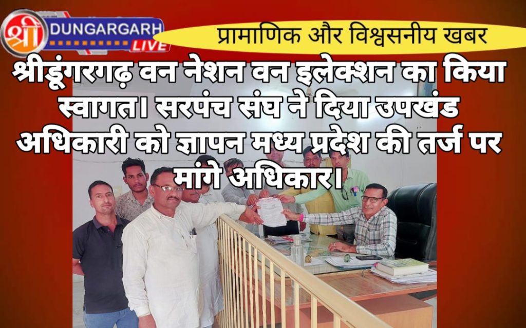श्रीडूंगरगढ़ सरपंच संघ द्वारा आज उपखंड अधिकारी को मुख्यमत्री के नाम एक ज्ञापन सोपा गया जिसमें मध्य प्रदेश की तर्ज पर चुनाव आगे बढ़ाने की स्थिति में बजट व अधिकारों की मांग की गई सरपंच संघ का कहना है कि भले ही सरकार वन नेशन वन इलेक्शन की तर्ज पर चुनाव करवाए हमें कोई आपत्ति नहीं है लेकिन उनके अधिकारों की पूरी तरह से रक्षा की जाए बजट सहित तमाम अधिकार उनके पास सुरक्षित रखे जाएं इस अवसर पर श्रीडूंगरगढ़ पंचायत समिति क्षेत्र के बड़ी संख्या में सरपंच व उनके प्रतिनिधि मौजूद रहे।सरपंच संघ के अध्यक्ष लक्ष्मण राम, कल्याणसर सरपंच प्रतिनिधि राकेश नायक, सुरजनसर सरपंच ओम प्रकाश शर्मा, धीरदेसर चोटियां सरपंच रामचंद्र चोटिया, पूनरासर सरपंच प्रकाशनाथ, पुनदलसर सरपंच प्रतिनिधि सीताराम, इंदपालसर सांखलान सरपंच प्रतिनिधि हरिराम जाखड़, गुसाईंसर सरपंच प्रतिनिधि सुभाष सहित बड़ी संख्या में जनप्रतिनिधि मौजूद रहे।