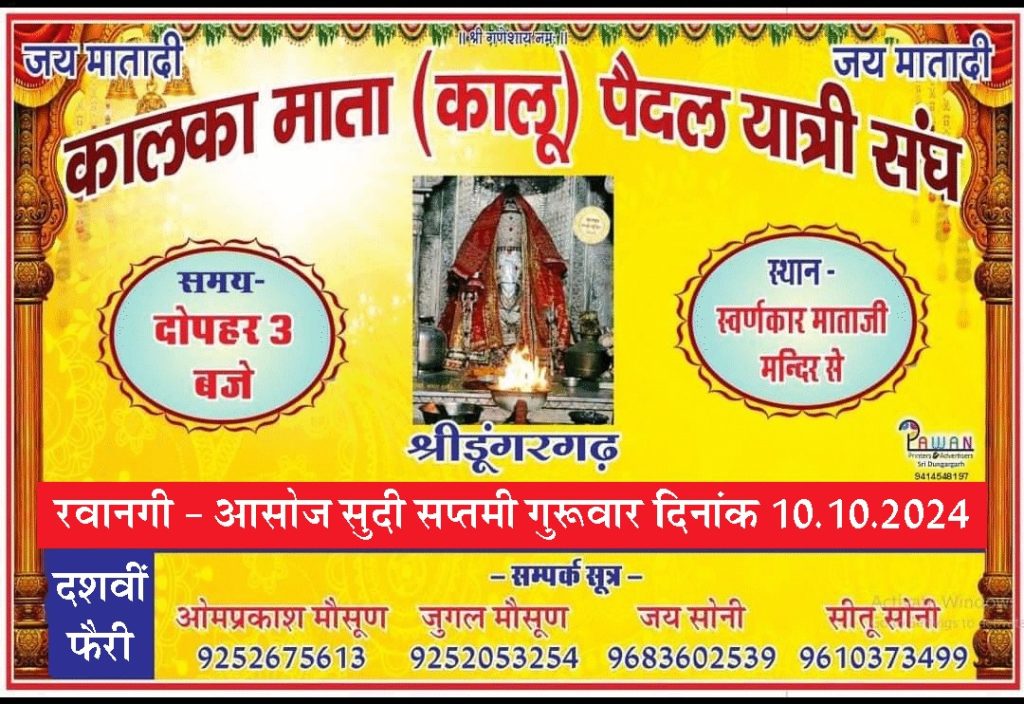 नवरात्र में हर वर्ष की भांति इस बार भी श्रीडूंगरगढ़ से कालू पैदल यात्री संघ रवाना होगा। जुगल मोशून सोनी ने बताया की कालका माता कालू की संघ के द्वारा ये 10वी फेरी है संघ तारीख 10 अक्टूबर 2024 को समय 3 बजे स्वर्णकार माता जी मंदिर से गाजे बाजे के साथ रवाना होगे। संघ में किसी प्रकार का शुल्क नहीं लिया जाएगा। बिलकुल फ्री पैदल यात्रा।कालका माता कालू पैदल यात्री संघ संपर्क सूत्र।जुगल मोसून 9252053254, ओमप्रकाश मोसुन 9252675613, जय सोनी 9683602539, सीतु सोनी 9610373499