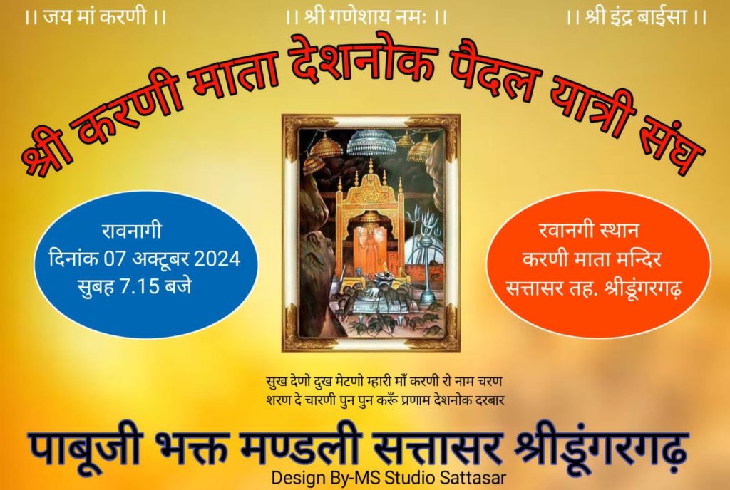 देशनाेक करनी मां के दरबार में दर्शन करने के लिए श्री पाबूजी भक्त मंडली सत्तासर पैदल यात्री संघ 7 अक्टूबर 2024 को रवाना होगा।दिनेश सिण्डोलिया ने बताया की देशनोक करणी माताजी के पैदल यात्री संघ 26 वी फेरी देने सत्तासर से दिनांक 7/10/2024 को सुबह 7.15 करणी माताजी मंदिर सत्तासर से डीजे साउंड के साथ बड़े ही धूमधाम से रवाना होगा । करनी माता पैदल इच्छुक यात्री संपर्क करें