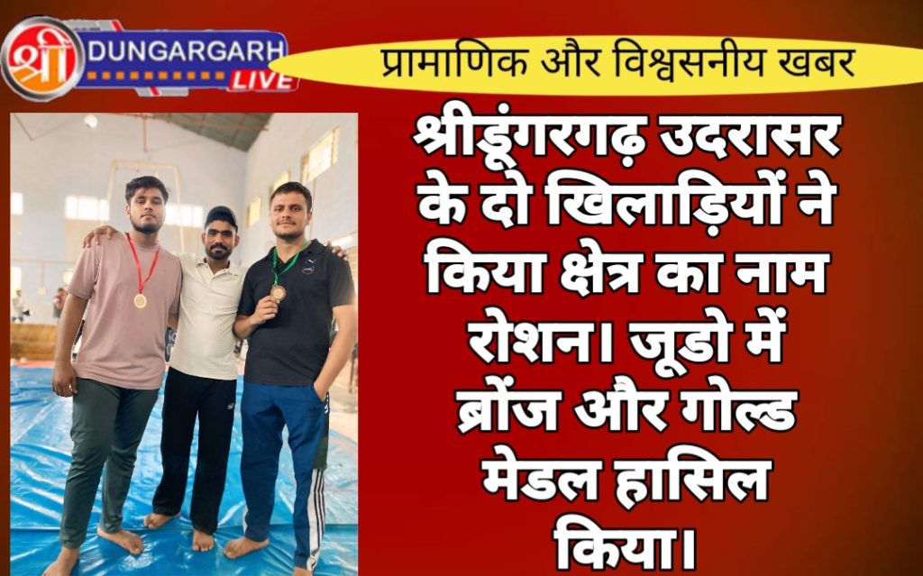 -क्षेत्र के गांव उदरासर के दो होनहार खिलाड़ियों ने जुडो में गोल्ड व ब्रोंज मैडल हासिल किया है। सीवीएस स्पोर्ट्स एकेडमी के कोच मुकेश खोड ने बताया की उदरासर निवासी अभिषेक सोनी पुत्र प्यारेलाल सोनी ने +100 किलोग्राम वेट में महाराजा गंगासिंह यूनिवर्सिटी के इंटर यूनिवर्सिटी टूर्नामेंट के दौरान श्रीगंगानगर की खालसा कॉलेज में 5 अक्टूबर को आयोजित टूर्नामेंट में शानदार खेल प्रदर्शन देते हुए जुडो में गोल्ड मैडल हासिल किया है। बता दे की अभिषेक का आल इंडिया जोन में सलेक्शन हो गया है। वही उदरासर के ही सचिन पुनिया पुत्र दयानंद पुनिया ने जुडो में +90 किलोग्राम वेट में ब्रोंज मैडल हासिल किया है। दो जाबाज खिलाड़ियों ने द नगर न्यूज़ को बताय की इस शानदार प्रदर्शन के लिए अपने माता पिता व कोच मुकेश खोड की मुख्य भूमिका है। जिन्होंने हमे आगे बढ़ने के लिए निरंतर प्रेरित किया। सीवीएस स्कूल व स्पोर्ट्स एकेडमी संचालक अशोक खोड ने दोनो खिलाड़ियों को बधाई देते हुए निरंतर आगे बढ़ने का आशीर्वाद दिया।