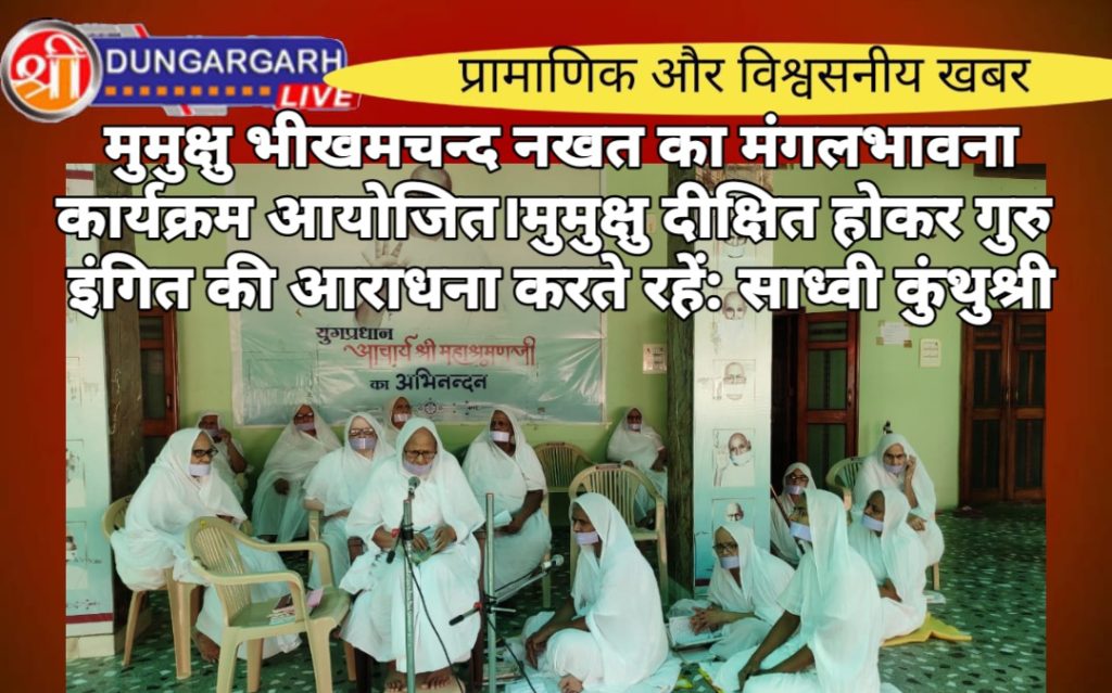 श्रीडूंगरगढ़ साध्वी सेवा केंद्र में वयोवृद्ध साध्वियों के दर्शनार्थ पहुंचे मुमुक्षु भीखमचन्द नखत को सेवा केंद्र व्यवस्थापिका साध्वी कुंथुश्री ने मंगल उद्बोधन प्रदान करते हुए कहा “भीखमचन्द नखत तेरापन्थ के आचार्यों की सेवा में सदैव तत्पर रहे हैं और अब ये दीक्षित होकर आचार्य महाश्रमण के शिष्य बनने जा रहे हैं। नखत गुरु इंगित की सदैव आराधना करते रहें और आत्म कल्याण के लिए अध्यात्म पथ पर अग्रसर रहें। साध्वी ने कहा कि दीक्षा जीवन के रूपांतरण की प्रक्रिया है। दीक्षित व्यक्ति संसार से संन्यास की ओर प्रस्थित होकर आत्म कल्याण के लिए अपने आप को और अपनी हर एक क्रिया को नियोजित करता है। साध्वी ललिताश्री, उपासक महालचन्द भंसाली, सभा मंत्री प्रदीप पुगलिया, अशोक बैद, महेंद्र मालू, दीपक सेठिया और महिला मंडल मंत्री संगीता बोथरा ने मुमुक्षु के प्रति मंगल भावना प्रकट की। मुमुक्षु भीखमचन्द नखत ने अपने श्रद्धास्वर उद्गारित करते हुए कहा कि आचार्यों की कृपादृष्टि सदैव मुझे मिली है। अब दीक्षित होकर उनकी कृपादृष्टि से आत्म कल्याण के लिए प्रस्थान करना है। कार्यक्रम में मुमुक्षु की मंगलभावना प्रकट करने के लिए अनेकों श्रावक श्राविकाएं मौजूद रहे।