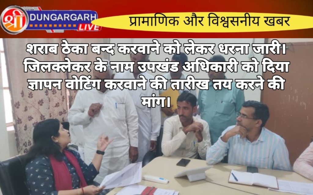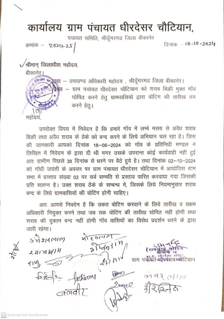 धीरदेसर चोटियान श्रीडूंगरगढ़ 10 अक्टूबर 2024, गांव में शराब ठेका बन्द करने की मांग को लेकर चल रहा धरना आज 38वें दिन जारी रहा बड़ी संख्या में लोगों ने सरकार की अनदेखी के खिलाफ अपना रोष व्यक्त किया । एडवोकेट श्याम सुन्दर आर्य ने बताया कि शराब ठेका बन्द करने की मांग को लेकर ग्राम पंचायत में 2 अक्टूबर को हुई ग्राम सभा मे आमजन ने सर्व सम्मति से वोटिंग करवाने का प्रस्ताव पारित किया था । जिसके लिए ग्रामीणों के शिष्टमंडल ने जिला कलेक्टर एवं जनसुनवाई में उपखण्ड अधिकारी को पत्र देकर वोटिंग की तारीख तय करने की मांग की है । वोटिंग होने तक धरना जारी रहेगा । आज धरने पर एडवोकेट श्याम सुन्दर आर्य, सरंपच रामचन्द्र चोटिया, पूर्व सरपंच मेघराज चोटिया, पूर्व सरपच तिलोकाराम, गजानन्द शर्मा, कुशलाराम मेघवाल, भंवरलाल, श्यामसिंह, किशन चोटिया आदि रहे ।