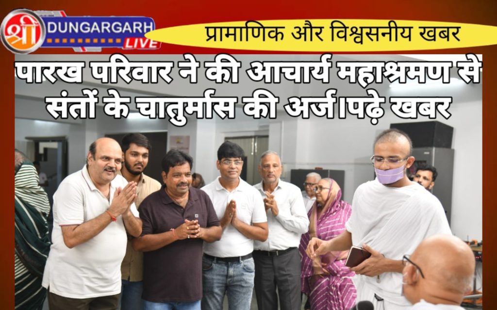 श्रीडूंगरगढ़ से नेता प्रतिपक्ष अंजू मनोज पारख ने सूरत में चातुर्मासिक प्रवास कर रहे जैनाचार्य आचार्य महाश्रमण के दर्शन किये। मनोज पारख ने बताया कि आचार्य महाश्रमण के श्रीडूंगरगढ़ के पारख परिवार द्वारा दर्शन करके श्रीडूंगरगढ़ में संतों का चातुर्मास देने की अर्ज की गई। मनोज पारख ने बताया कि आचार्य ने कहा कि समय आने पर इस विषय पर ध्यान दिया जाएगा। इस दौरान जैन समाज की केंद्रीय संस्था अमृतवाणी के मंत्री अशोक पारख, सजना पारख, विकास पारख, यश पारख मौजूद रहे।