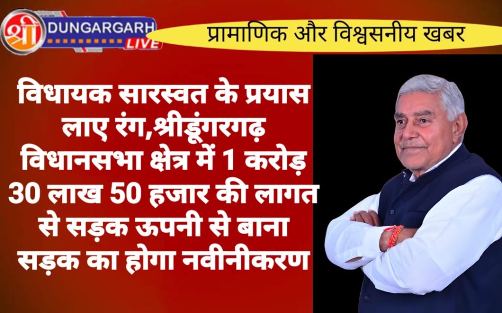 राजस्थान विधानसभा सत्र के दौरान विधायक ताराचंद सारस्वत ने विभिन्न मांगो के साथ क्षेत्र की विभिन्न सड़क निर्माण कार्यों की मांगे भी रखी थी जिसको संज्ञान में लेते हुए मुख्यमंत्री श्री भजनलाल शर्मा एवं उपमुख्यमंत्री एवं सार्वजनिक निर्माण मंत्री दिया कुमारी ने श्रीडूंगरगढ़ क्षेत्र को नई सौगात दी जिसके परिणाम स्वरूप श्रीडूंगरगढ़ विधानसभा के ग्राम ऊपनी से ग्राम बाना के बीच 9 किलोमीटर सड़क नवीनीकरण के लिए वित्तीय स्वीकृति जारी करदी। विधायक सारस्वत ने बताया कि राजस्थान विधानसभा में माननीय मुख्यमंत्री एवं उपमुख्यमंत्री से क्षेत्र की सड़को के नवीनीकरण के लिए विशेष बजट देने की मांग की गई थी। विधायक सारस्वत ने श्रीडूंगरगढ़ विधानसभा क्षेत्र में एक करोड़ 30 लाख 50 हजार की सड़क निर्माण के लिए वित्तीय स्वीकृति जारी करने पर माननीय मुख्यमंत्री श्री भजनलाल जी शर्मा एवं उपमुख्यमंत्री दिया कुमारी जी हार्दिक आभार व्यक्त किया। इस सौगात के लिए ग्रामवासियों ने विधायक का आभार जताया ।