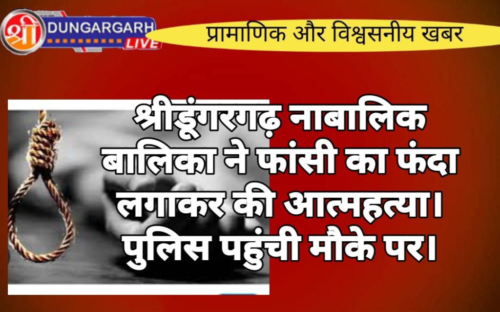 थाना क्षेत्र के बिग्गा बास श्रीडूंगरगढ़ इलाके में एक नाबालिग बालिका द्वारा फांसी का फंदा लगाकर आत्महत्या करने की घटना सामने आई है। मिली जानकारी के अनुसार बालिका ने घर के छत पर बने एक टीन शेड के नीचे चुन्नी से फंदा लगाकर आत्महत्या कर ली ।फिलहाल मृतक के शव को श्रीडूंगरगढ़ अस्पताल की मोर्चरी में रखवाया गया है। घटना की जानकारी मिलने पर एएसआई रविंदर सिंह हेड कांस्टेबल भगवानाराम 112 टीम के साथ मौके पर पहुंचे हैं और मामले की जांच कर रहे हैं।