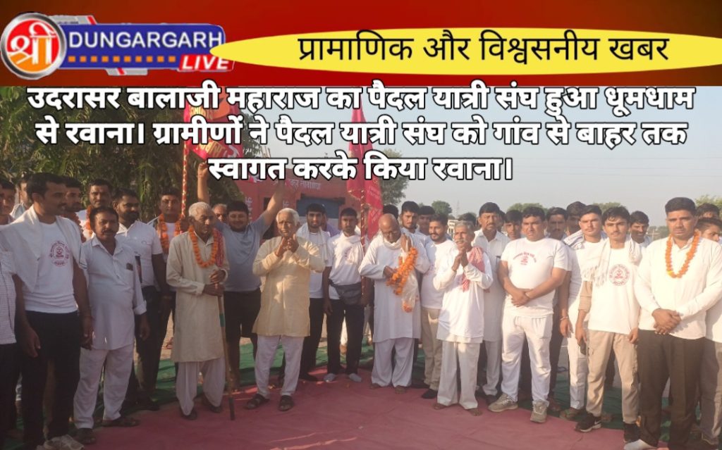 श्रीडूंगरगढ़ क्षेत्र से सालासर बालाजी महाराज के पैदल यात्री संघ तीन दिन से लगातार रवाना हो रहे है। लगभग हर गांव से पैदल यात्री नाचते गाते हुवे सालासर जा रहे है। क्षेत्र के गांव गुसाईसर , डेलवा,ठुकरियासर , जैतासर सुरजनसर, आडसर ओर उदरासर से दो संघ रवाना हो गए है। उदरासर से कल हरिराम बाबा मंदिर से संघ सालासर बालाजी रवाना हुआ ।ओर आज एक संघ आथुना बास बालाजी मंदिर से रवाना हुआ । पूरे गांव में डीजे के साथ भजनों और गीतों पर बालाजी महाराज के पैदल यात्री नाचते गाते हुवे निकले। उदरासर गांव में आज दूसरा पैदल यात्री संघ निकला। पत्रकार पवन सारस्वत ने बताया की संघ को रवाना करने पूरा गांव जिसने बच्चे बूढ़े सभी मिलकर संघ को रवाना किया । आज जो संघ निकला उसमे लगभग 150 से ऊपर पैदल यात्री थे जय सालासर बालाजी महाराज के जयकारों से पूरा गांव गूंज उठा।संघ गांव के बाहर सरस धर्मकांटे पर बीरबल तावनिया ओर ग्रामीणों ने स्वागत किया। तावनिया ने चाय की सेवा दी और संघ को हरी झंडी दिखाकर रवाना किया। संघ गांव आडसर में पहुंचा तो उदरासर गांव के रामचंद्र गोदारा, कानाराम गोदारा ने चाय और नाश्ता की सेवा दी। ग्रामीणों में पूर्व सरपंच तुलछीराम गोदारा, बाबूलाल पंचारिया, गोपालराम पंचारिया, सीताराम पंचारिया,मोहन राम तावनिया, श्रीराम गोदारा, बेगाराम नाई केसुराम सोनी, पत्रकार पवन सारस्वत,मुखराम गोदारा आदि ग्रामीण मोजूद रहे।