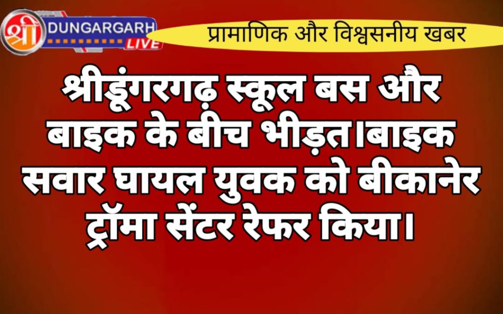 श्रीडूंगरगढ़ ग्रामीण क्षेत्र में स्कूल बस बाइक के बीच भिड़ंत होने से एक युवक गंभीर रूप से घायल हो गया। हेड कॉन्स्टेबल हरिराम मीणा से मिली जानकारी के अनुसार बाड़ेला गांव के पास एक निजी स्कूल बस व बाइक के बीच भिड़ंत हो गई जिससे बाइक सवार युवक गंभीर रूप से घायल हो गया राहगीरों द्वारा घायल युवक को श्रीडूंगरगढ़ अस्पताल लाया गया जहां हाथ पैर में फैक्चर होने की वजह से बीकानेर ट्रॉमा सेंटर रेफर किया गया है। घायल युवक एक फाइनेंसकर्मी बताया जा रहा है युवक की पहचान अनिल कुमार पुत्र मुखराम बावरी रायसिंहनगर के रूप में हुई है फिलहाल पुलिस ने बस को जप्त कर लिया है।