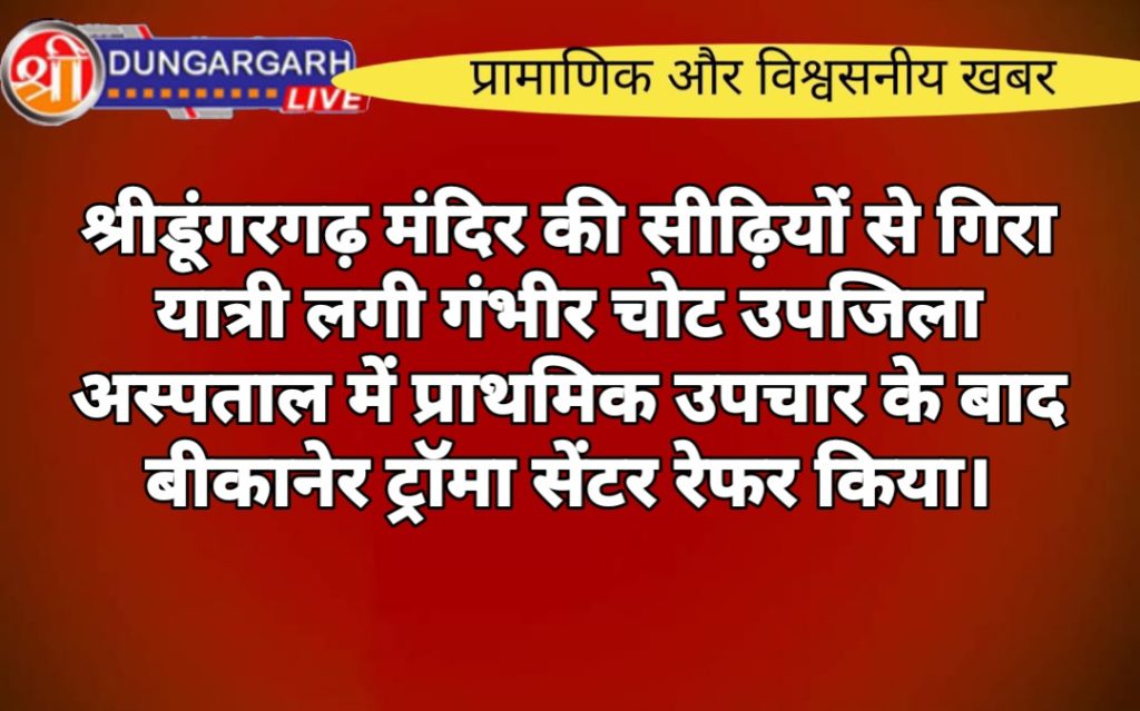 उपखंड में सभी बड़े मंदिरों में अभी यात्रियों की भीड़ है और मेल चल रहे हैं। तोलियासर के ऐतिहासिक काल भैरव मंदिर में दर्शन करने आए यात्री रात को मंदिर व गेस्ट हाउस में रुक रहे हैं आज सुबह एक यात्री मंदिर की छत से उतर रहा था और सीढ़ियों से पांव फिसल गया जिससे वह नीचे गिर गया और गंभीर चोट लग गई घटना की जानकारी एपीजे अब्दुल कलाम समिति को दी गई जिसके बाद क्विक एंबुलेंस मौके पर पहुंची और घायल यात्री को उप जिला अस्पताल ले गया जहां प्राथमिक उपचार करने के बाद पीबीएम ट्रॉमा सेंटर रेफर कर दिया गया है। घायल यात्री सुभाष पुत्र चंदू राम उम्र 55 वर्ष जाति धानक निवासी राजपुरिया नोहर हनुमानगढ़ निवासी बताया गया है।