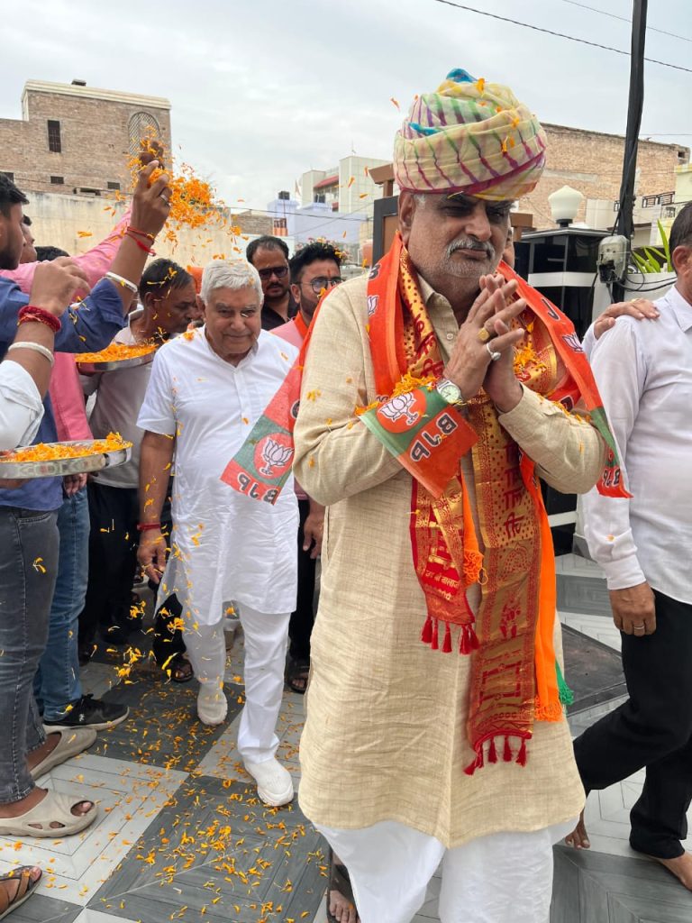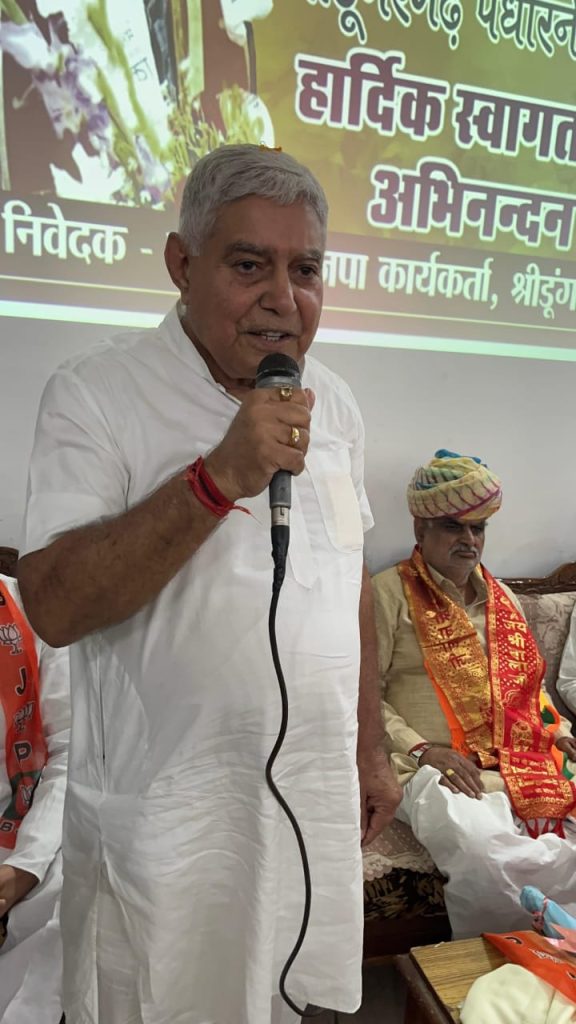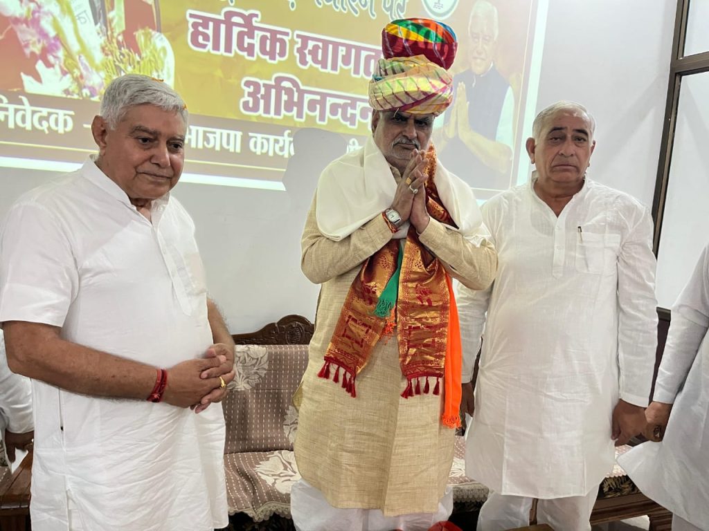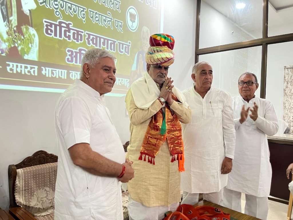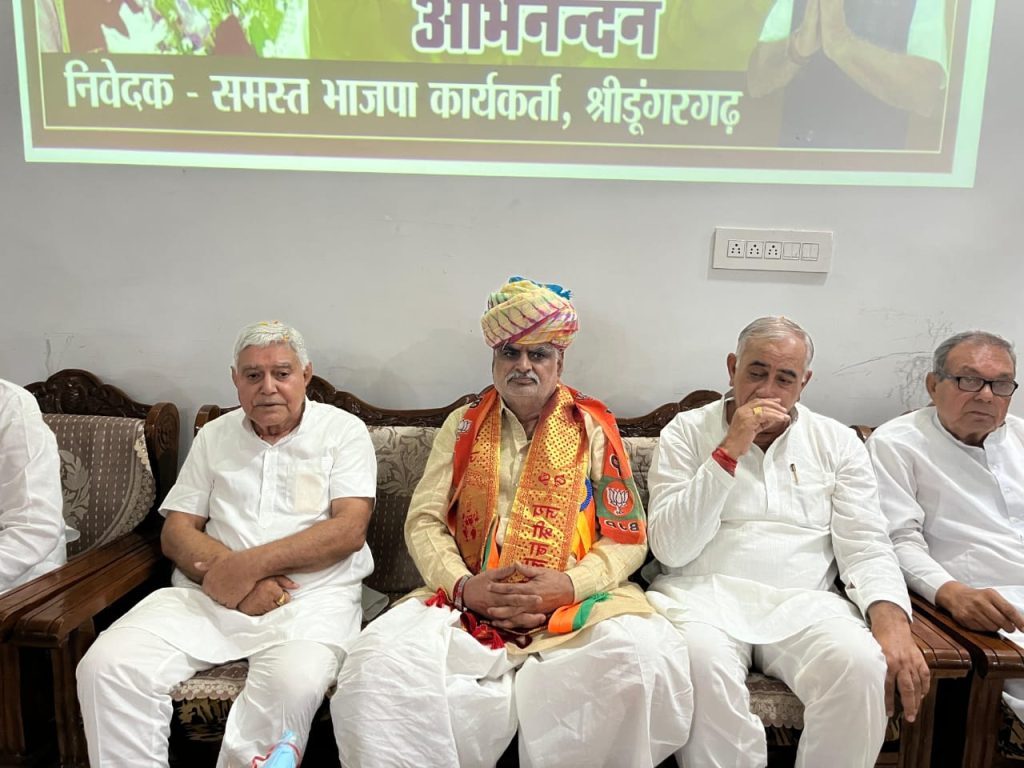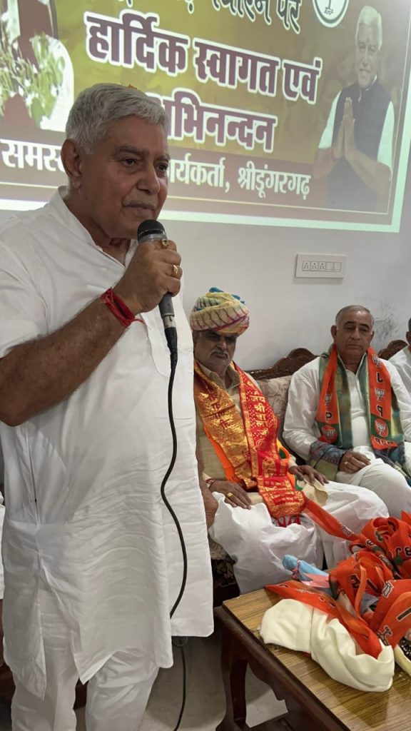 भाजपा कार्यालय श्रीडूंगरगढ़ पधारे राजस्थान सरकार के स्वायत्त शासन मंत्री श्री झाबर सिंह खर्रा का श्रीडूंगरगढ़ विधायक ताराचंद सारस्वत ने साफा पहनाकर तथा विश्वकर्मा कल्याण बोर्ड के अध्यक्ष रामगोपाल सुथार ने शॉल ओढ़ाकर स्वागत अभिनंदन किया। इस दौरान श्रीडूंगरगढ़ विधायक ताराचंद सारस्वत ने मंत्री झाबर सिंह खर्रा एवं राजस्थान सरकार द्वारा बजट में दी गए विकास कार्यों के लिए धन्यवाद ज्ञापित किया तथा नगरपालिका श्रीडूंगरगढ़ में पड़े रिक्त पदों की भर्ती करने और शहर में सिवरेज/ड्रेनेज को डवलप करवाने सहित शहरी क्षेत्र विकास कार्यों हेतु बजट पास करवाने की मांग रखी । विधायक सारस्वत ने पूर्व सरकार के समय में श्रीडूंगरगढ़ नगर क्षेत्र की भूमि पर बने फर्जी पट्टो की निष्पक्ष जांच करके उचित कार्यवाही करने की मांग भी रखी । इस बीच स्वायत्त शासन मंत्री झाबर सिंह खर्रा ने श्रीडूंगरगढ़ में शानदार स्वागत अभिनंदन के लिए विधायक सारस्वत सहित सभी पार्टी कार्यकर्ताओं का आभार जताया तथा जल्द से जल्द प्राप्त मांगो को पूरा करने का आश्वाशन दिया तथा प्रधानमंत्री नरेन्द्र मोदी और मुख्यमंत्री भजनलाल शर्मा के नेतृत्व में हो रहे विकास कार्यों के बारे में बताया । इस बीच विश्वकर्मा कल्याण बोर्ड के अध्यक्ष रामगोपाल सुथार ने उपस्थित सभी कार्यकर्ताओं को आभार जताया ।