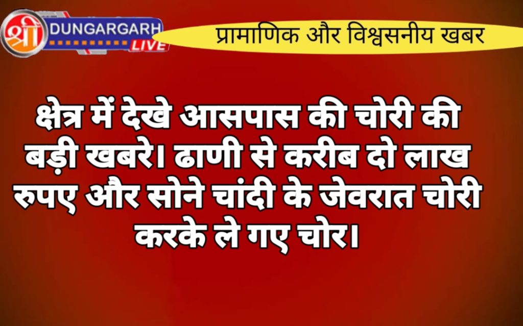 कोलायत थाने के झझू गांव की रोही में भंवरराम जाट की ढाणी में चोरी हुई है। भंवरराम ने पुलिस को रिपोर्ट दी है कि रात करीब बारह बजे बाद उसकी ढाणी में अज्ञात चोर ने घुसकर एक लाख 90 हजार रुपए नगद चोरी कर लिए। इसके अलावा लाखों रुपए के गहने भी चोरी कर लिए, जिसमें अधिकांश गहने महिलाओं के थे। गहनों की लिस्ट भी पुलिस को सौंपी गई है। पुलिस ने चोरी का मामला दर्ज करते हुए छानबीन शुरू की है। मामले की जांच हेड कांस्टेबल सुगनाराम को सौंपी गई है।