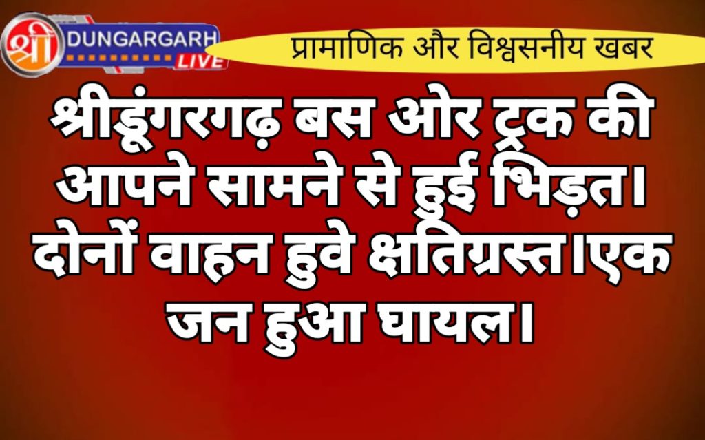 श्रीडूंगरगढ़ क्षेत्र में आए दिन हो रहे है सड़क हादसे आज सुबह सुबह मिली जानकारी के हिसाब से तोलियासर ग्राम में बस स्टैंड पर एक बस ओर ट्रक की आपने सामने से भिड़त हुई जिसमें दोनों वाहन पूरी तरह से क्षतिग्रस्त हो गए है बस बीकानेर से सरदारशहर जा रही थी।वही ट्रक सामने से आ रहा था। एक जना घायल हुआ है जिसको निजी वाहन से उपजिला अस्पताल पहुंचाया गया है।ग्रामीणों ने आरोप लगाया कि चार दिवसीय मेला चालू है लेकिन पुलिस का कोई जाप्ता या कोई बेरीकेट नहीं लगाया गया है। बड़ी संख्या में ग्रामीण जमा हो गए ।