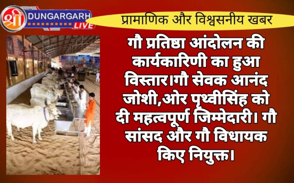 बीकानेर गौ सांसद एडवोकेट विनोद शर्मा ने कार्यकारिणी का विस्तार करते हुए राजस्थान प्रभारी बाबूलाल जांगिड़ की अनुशंसा पर आनंद जोशी को बीकानेर देहात गौ सांसद एवं धर्मेंद्र सारस्वत को बीकानेर पूर्व गौ विधायक,रामदयाल राजपुरोहित को बीकानेर पश्चिम गौ विधायक,श्रवन कुमार कायल को लूणकरणसर गौ विधायक, सुभाष आचार्य को कोलायत गौ विधायक,बनवारी लाल डेलू को नोखा गौ विधायक,पृथ्वी सिंह राजपुरोहित को श्रीडूंगरगढ़ गौ विधायक, नरपत दान को खाजूवाला गौ विधायक नियुक्त किया गया और गौ माता को राष्ट्रमाता बनाने के लिए अपने तन मन धन से सहायता करते रहेंगे और उम्मीद है राजस्थान सरकार जल्दी ही राजस्थान में गौ माता को राज्य माता घोषित कर देगी क्योंकि 31 विधायकों ने मुख्यमंत्री को पत्र लिखा है की देसी गौ माता को राज्य माता घोषित करो सभी से आग्रह किया गया है।गाय माता को राष्ट्र माता घोषित करवाने के लिए सभी अपने-अपने स्तर पर अथक प्रयास करें और करते रहेंगे।