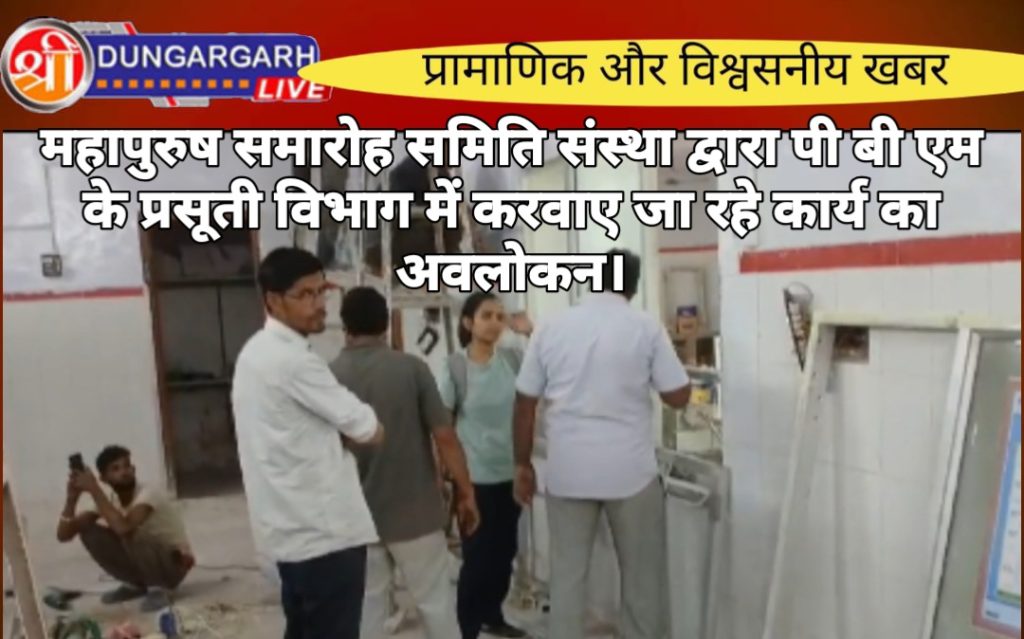 महापुरुष समारोह समिति के तत्वावधान में संभाग के सबसे बड़े राजकीय चिकित्सालय पी बी एम अस्पताल बीकानेर के प्रसूति विभाग में चालीस लाख रुपए से भी ज्यादा राशि का जीर्णोद्धार का कार्य श्री डूंगरगढ़ कस्बे के भामाशाहों के सहयोग से करवाया जा रहा है । संस्था अध्यक्ष श्रीगोपाल राठी के नेतृत्व में संस्था सदस्य विजयराज सेवग, त्रिलोकचंद गहलोत, विभागाध्यक्ष डॉ स्वाती फ्लोदिया, डॉ पारुल, भामाशाह श्याम सुंदर चांडक, इंजीनियर अरुंधति ने आज 22 अक्टूबर को पी बी एम के प्रसूति विभाग में संस्था द्वारा करवाए जा रहे जीर्णोद्धार कार्य का निरीक्षण कर प्रोग्रेस रिपोर्ट ली । राठी ने कार्य स्थल पर आमजनजन की सुविधा हेतु अन्य आवश्यक सुविधाओं के निर्देश ठेकेदार एवं सामग्री सप्लायर्स को दिए । इस अवसर पर विभागाध्यक्ष डॉ स्वाती फ्लोदिया ने आमजन की सुविधार्थ करवाए जा रहे इस पुनीत कार्य के लिए श्रीडूंगरगढ़ तहसील के भामाशाहों एवं महापुरुष समारोह समिति के सभी पदाधिकारियों का आभार प्रकट किया ।