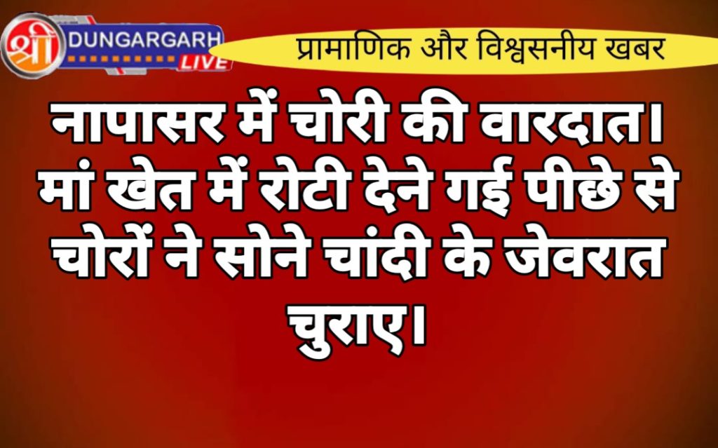 नापासर थाना क्षेत्र में चोरों ने एक घर से सोने-चांदी के जेवरात और नगद रुपए चोरी कर लिए। चोरी की ये वारदात सींथल में हुई है, जहां पुलिस ने मौके पर पहुंचकर मौका मुआयना किया है।थानाधिकारी जसवीर ने बताया- वारदात नापासर थाना क्षेत्र के सींथल में एक बंद मकान में सेंधमारी करते हुए चोरी की वारदात को अंजाम दिया है। इस संबंध में सींथल निवासी वासुदेव पुत्र मुलदान चारण ने पुलिस को रिपोर्ट दी है कि 22 अक्टूबर को उसके घर में चोरी हुई। उसकी मां खेत में काम कर रहे परिवार को खाना देने गई थी। पीछे मकान बंद था। जब मां वापस घर लौटी तो सामान बिखरा हुआ था। अज्ञात व्यक्ति घर से 70 हजार रुपए नकदी तथा सोने-चांदी के जेवरात चोरी कर ले गया। पुलिस ने मामला दर्ज कर जांच एएसआई संतोष नाथ को सौंपी है। थाना अधिकारी जसवीर ने बताया कि जल्दी ही आरोपी पुलिस की पकड़ में होंगे। पुलिस टीम ने सीसीटीवी फुटेज खंगाले हैं और आरोपियों की पहचान करने में लगे हुए हैं। सींथल गांव में लगे सीसीटीवी फुटेज के साथ ही अन्य मुख्य मार्गों पर लगे सीसीटीवी भी देखे जा रहे हैं। ग्रामीण क्षेत्रों में चोरी की घटनाएं लगातार बढ़ती जा रही है।