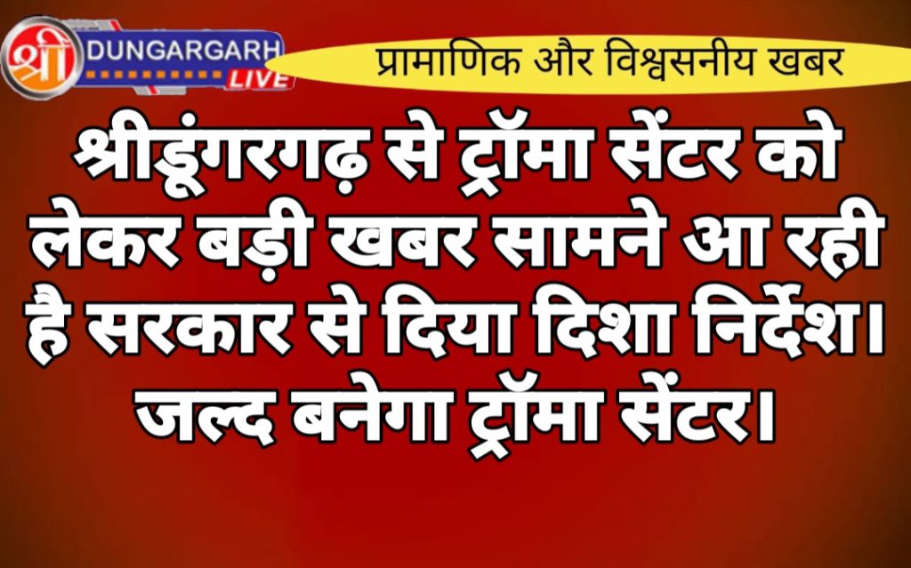 श्रीडूंगरगढ़ की सबसे बड़ी डिमांड ट्रॉमा सेंटर की मांग को लेकर एक बड़ी खबर निकलकर सामने आ रही है जहां राज्य सरकार द्वारा श्री डूंगरगढ़ में ट्रॉमा सेंटर निर्माण कार्य की सभी अड़चनों को दूर कर दिया गया है और दिशा निर्देश जारी कर दिए गए हैं। बाहेती चांडक परिवार के साथ जो अनुबंध हुआ था उसी के अंतर्गत भामाशाह परिवार ट्रॉमा सेंटर बनाएगा इसको लेकर सरकार द्वारा दिशा निर्देश जारी कर दिए गए हैं। श्रीडूंगरगढ़ क्षेत्र की जनता के लिए यह बड़ी खबर निकलकर सामने आ रही है।